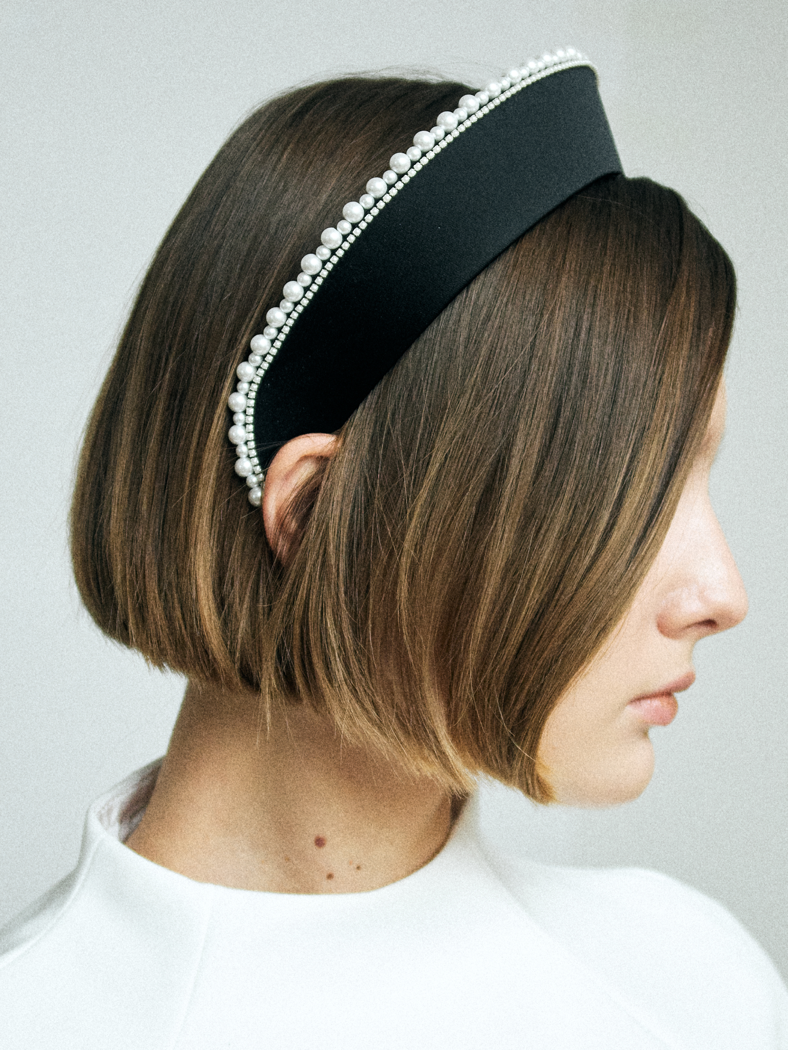 Резинка из белой кожи с декором из жемчуга и серебристых элементов