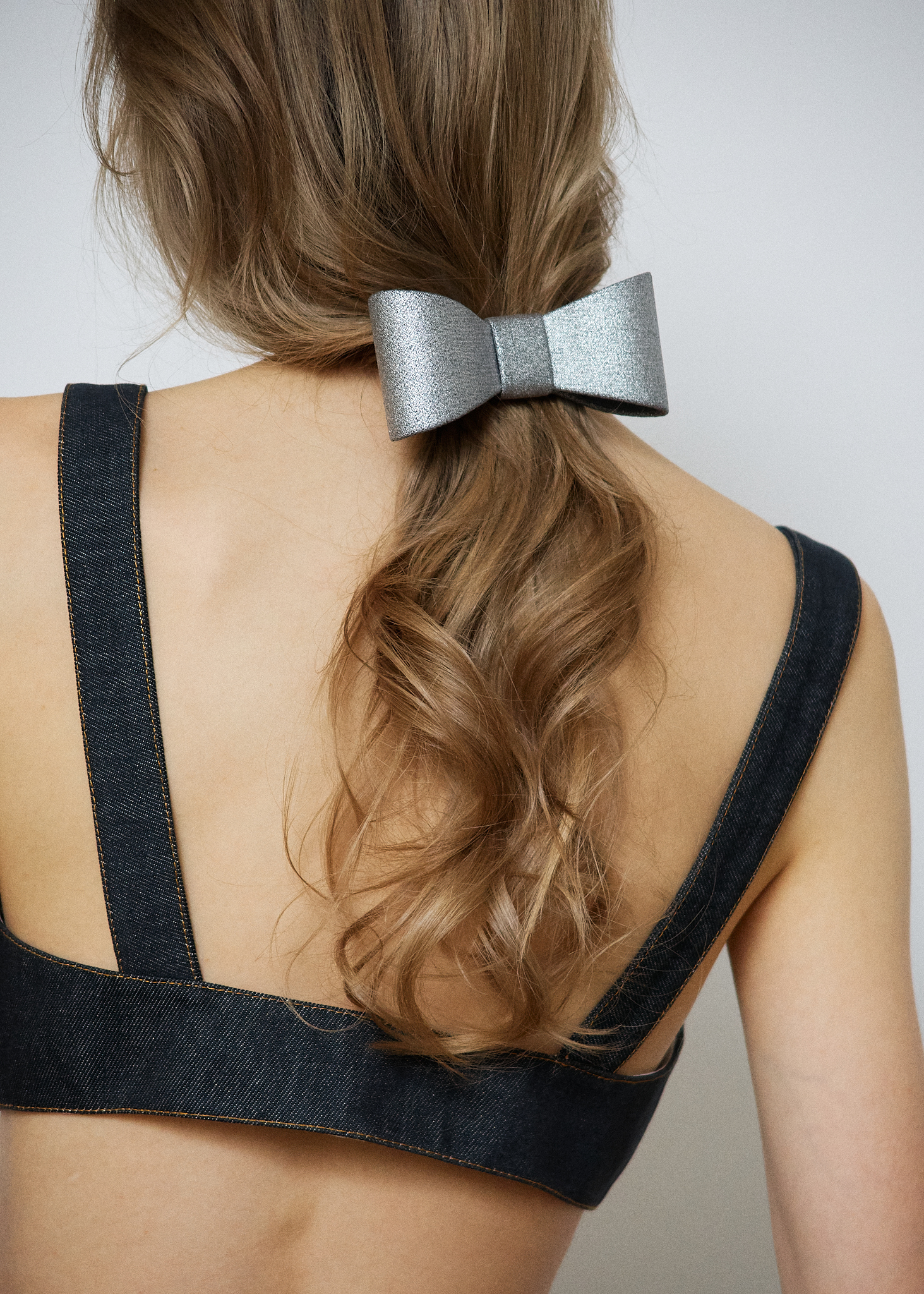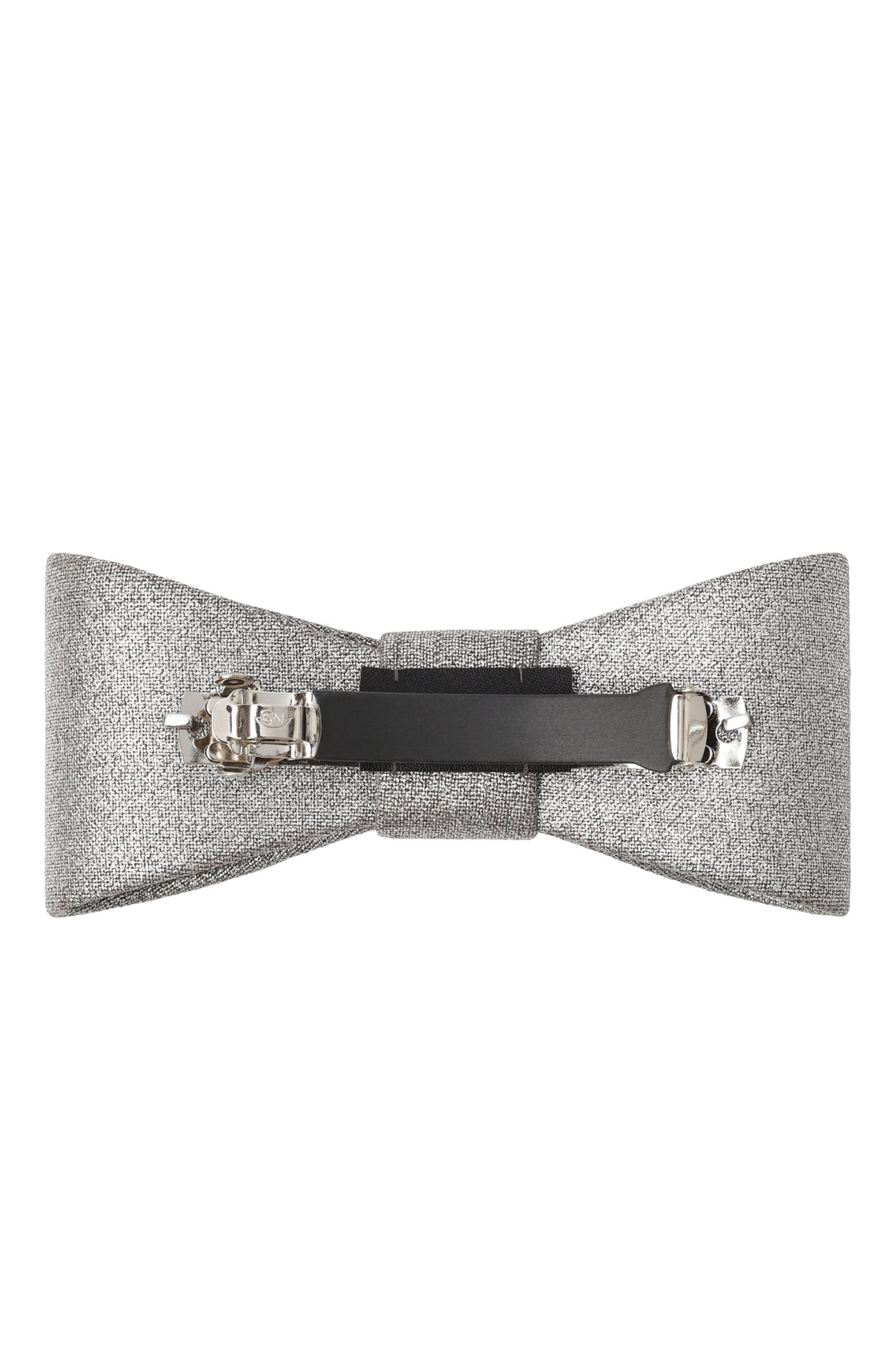 Бант-бабочка выполнен вручную из 100% шерсти с добавлением металлизированных нитей серебристого цвета. Бант крепится на заколку-автомат и держится как на мальвинке, так и на целом хвосте.