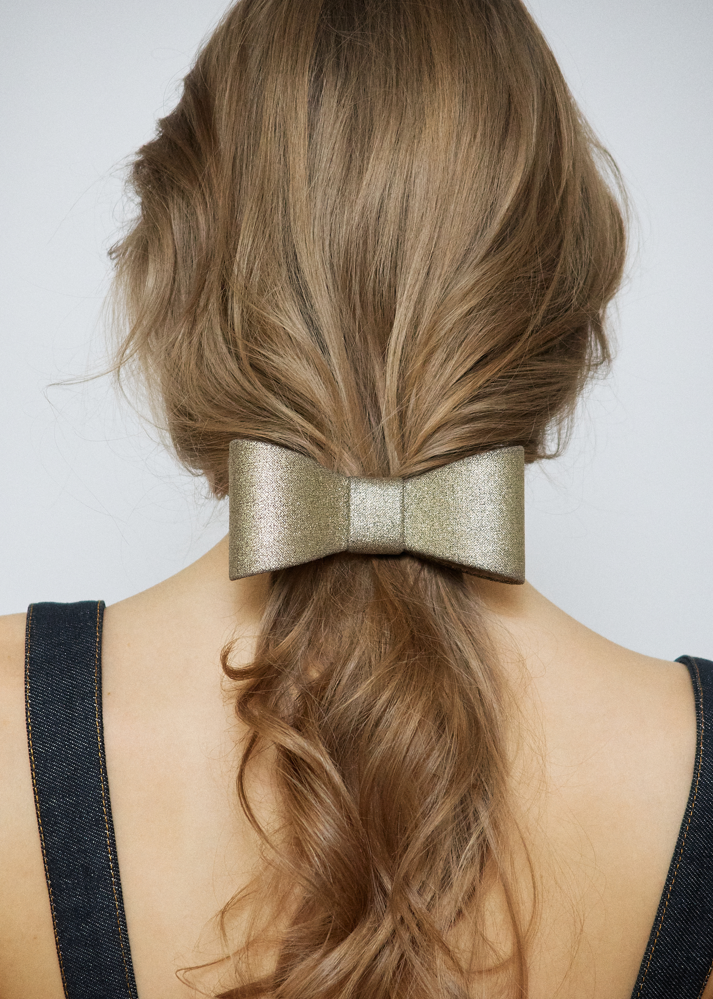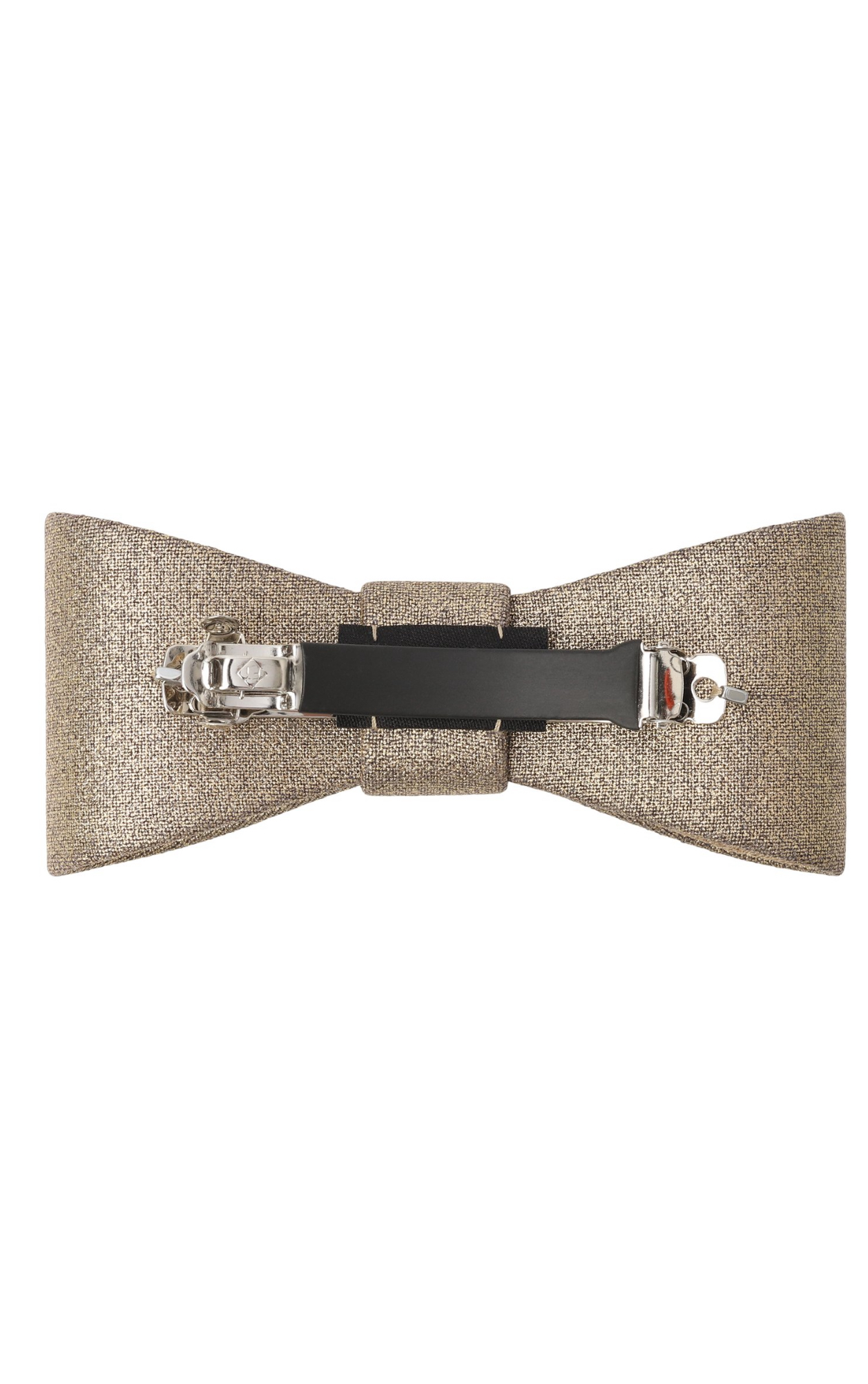Бант-бабочка выполнен вручную из 100% шерсти с добавлением металлизированных нитей золотого цвета. Бант крепится на заколку-автомат и держится как на мальвинке, так и на целом хвосте.