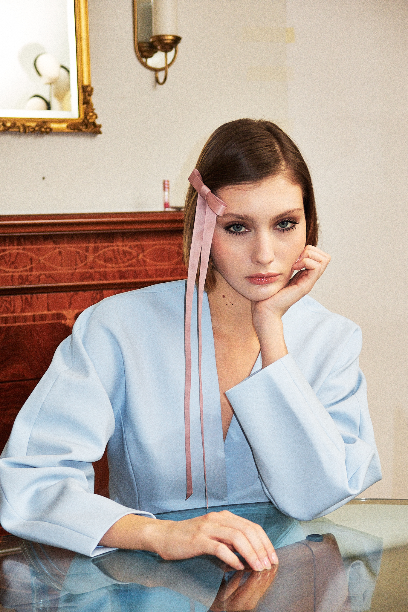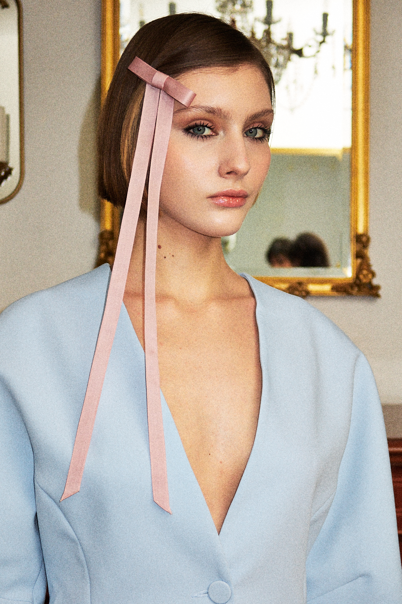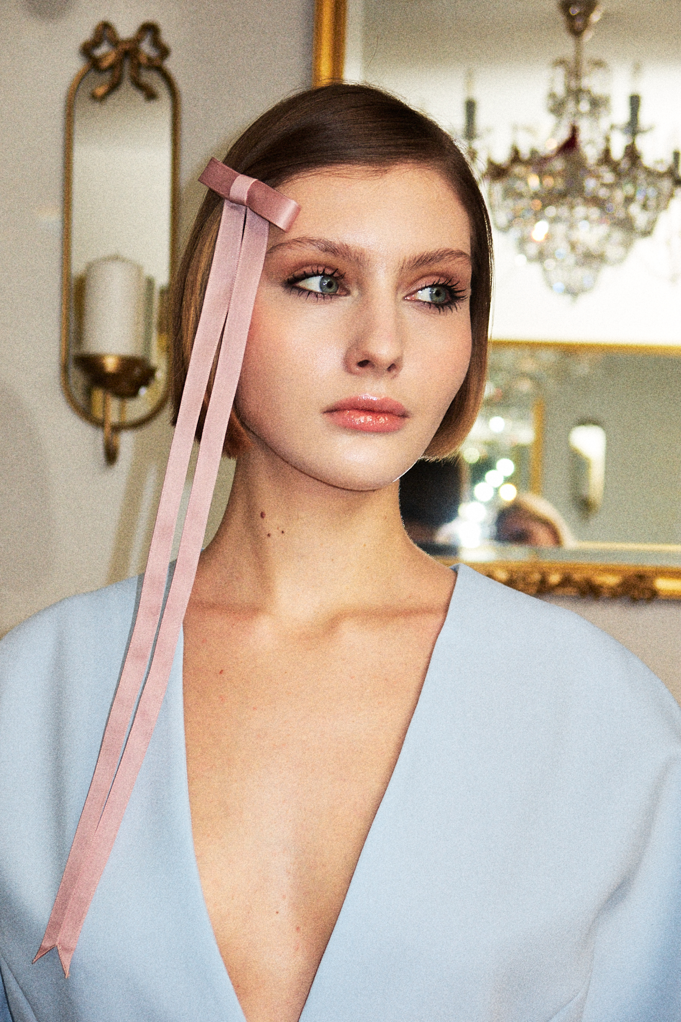 Его длинные ленты мягко скользят по волосам, создавая идеальный акцент для романтичной укладки, элегантного пучка или свободных локонов. Но не ограничивайтесь только прической — он одинаково эффектно смотрится на шее, как лента-галстук.