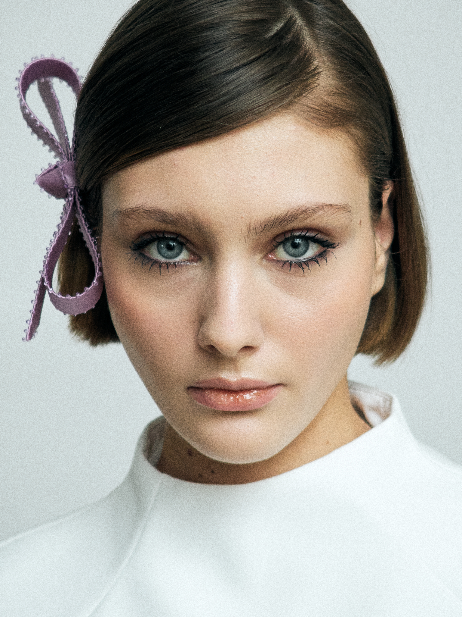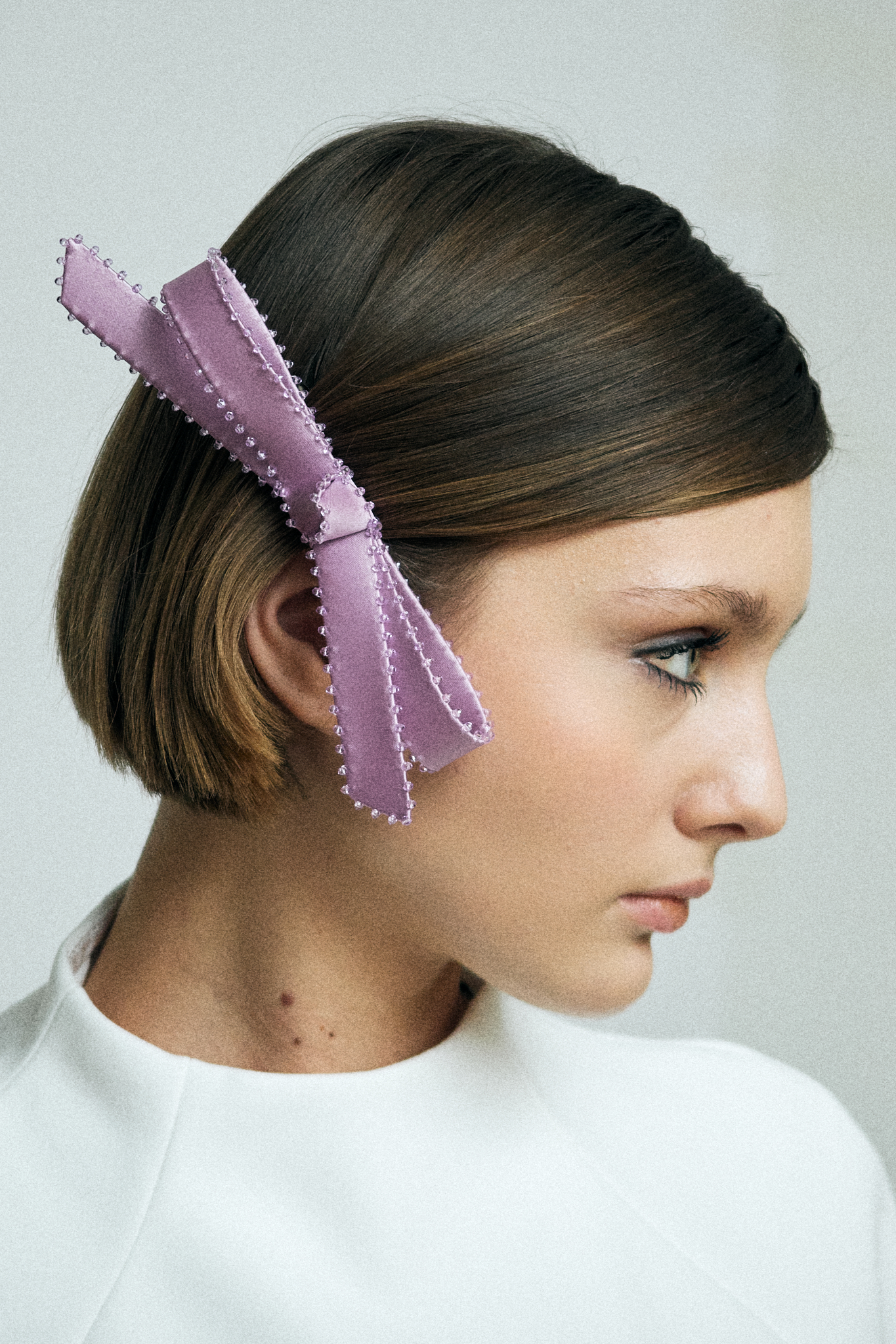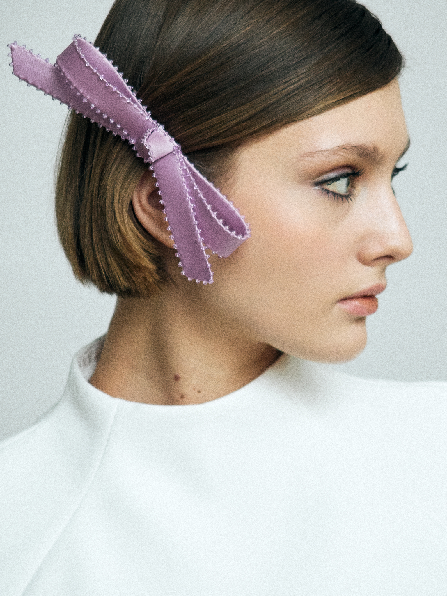 Миниатюрный бант "Стрекоза" из сиреневого шелкового атласа, способный придать прическе необычный вид.