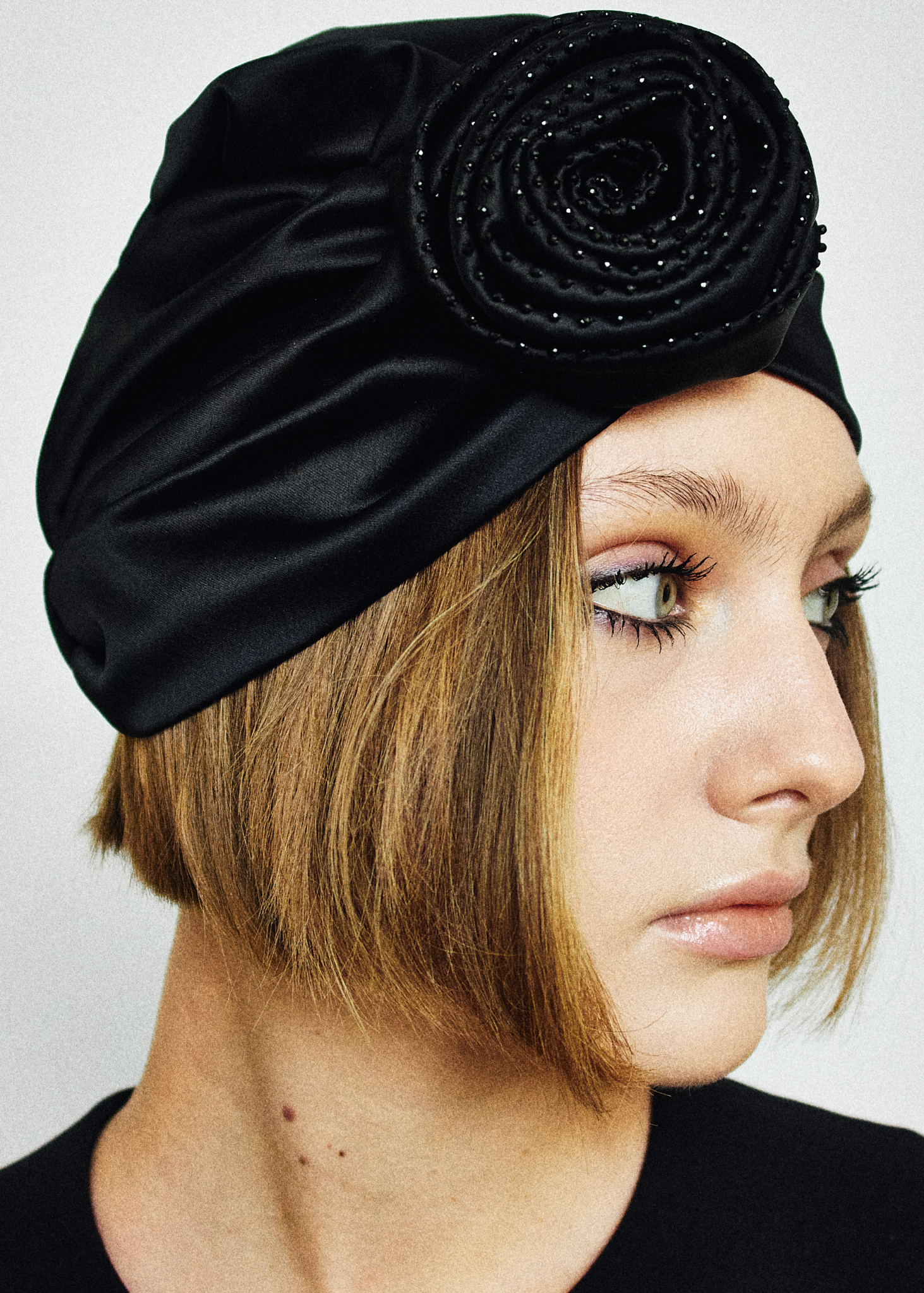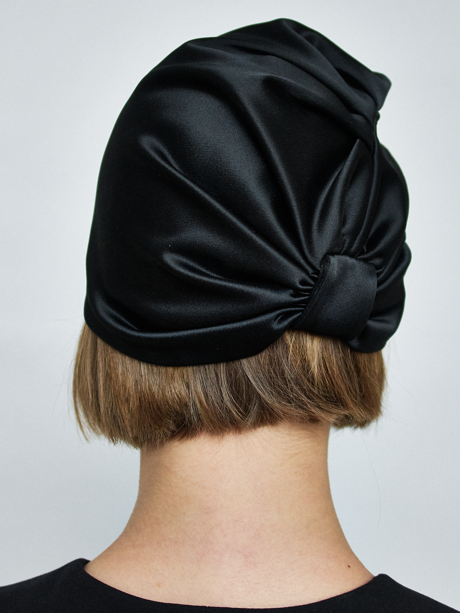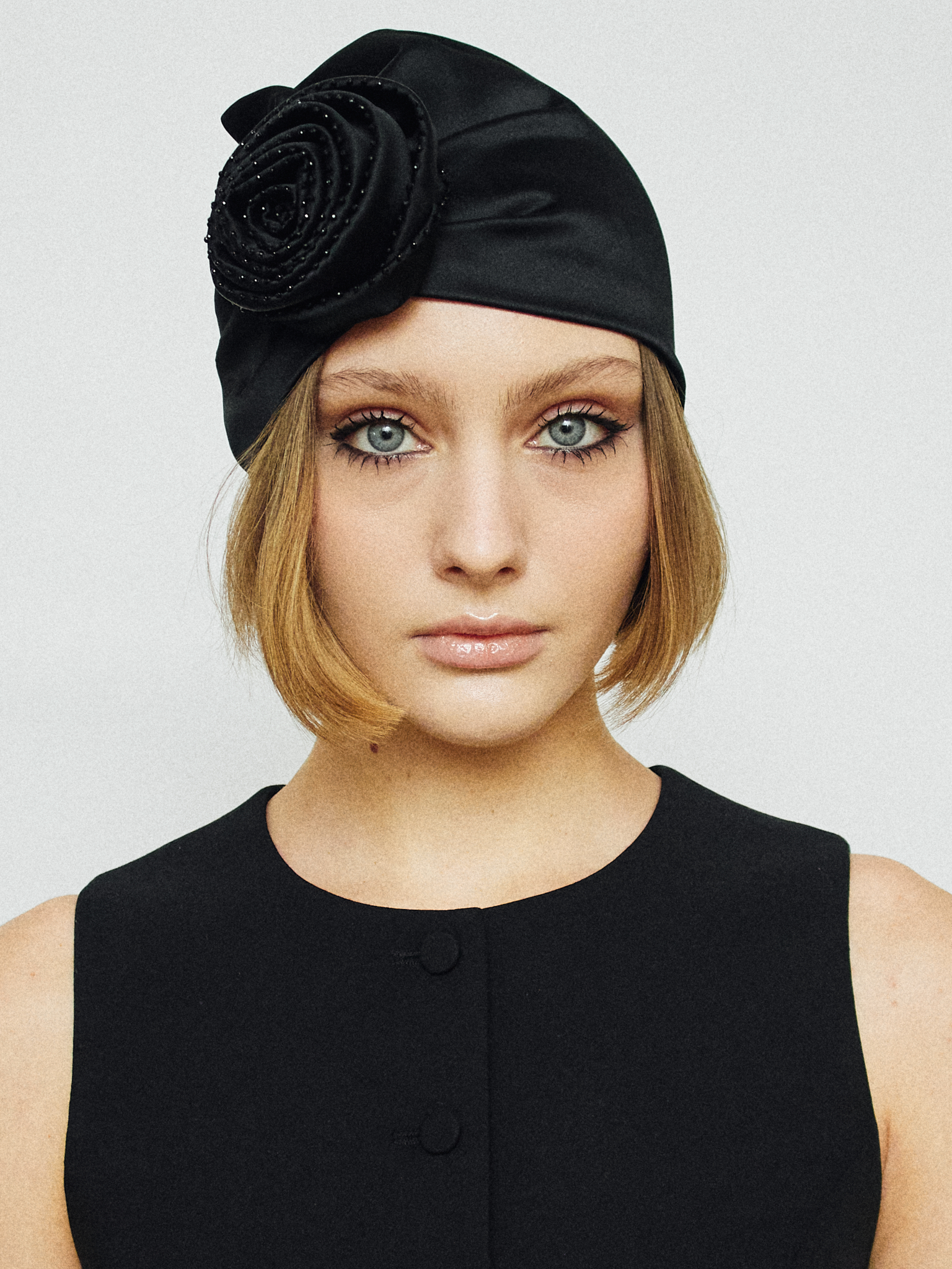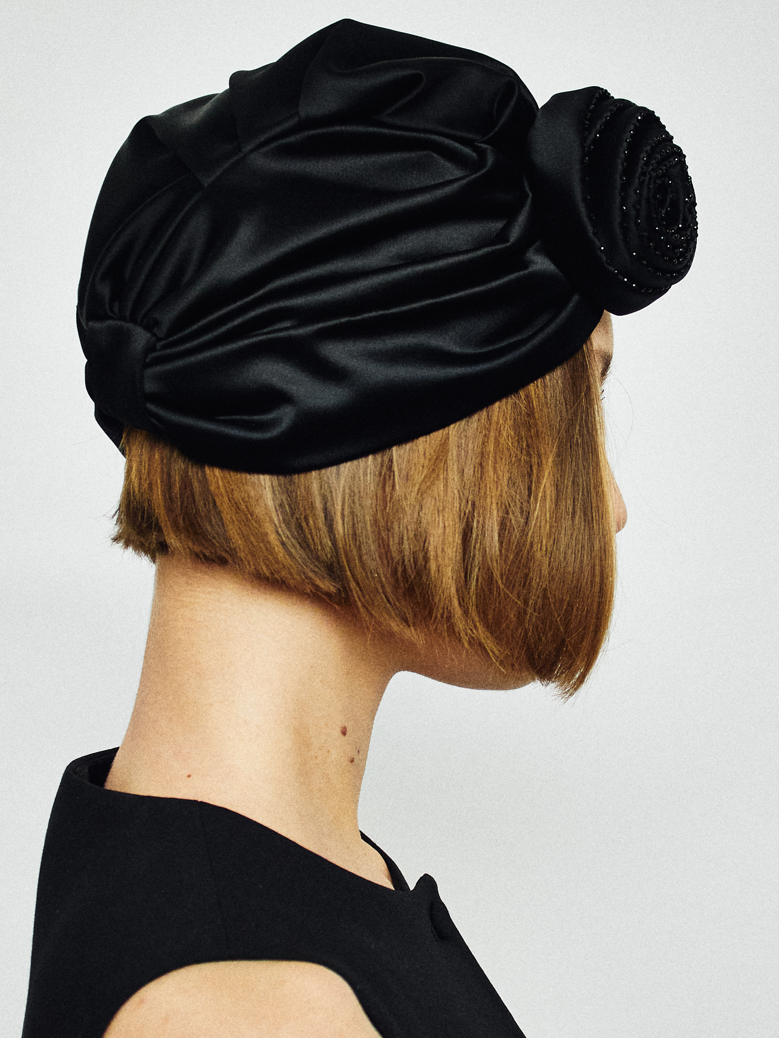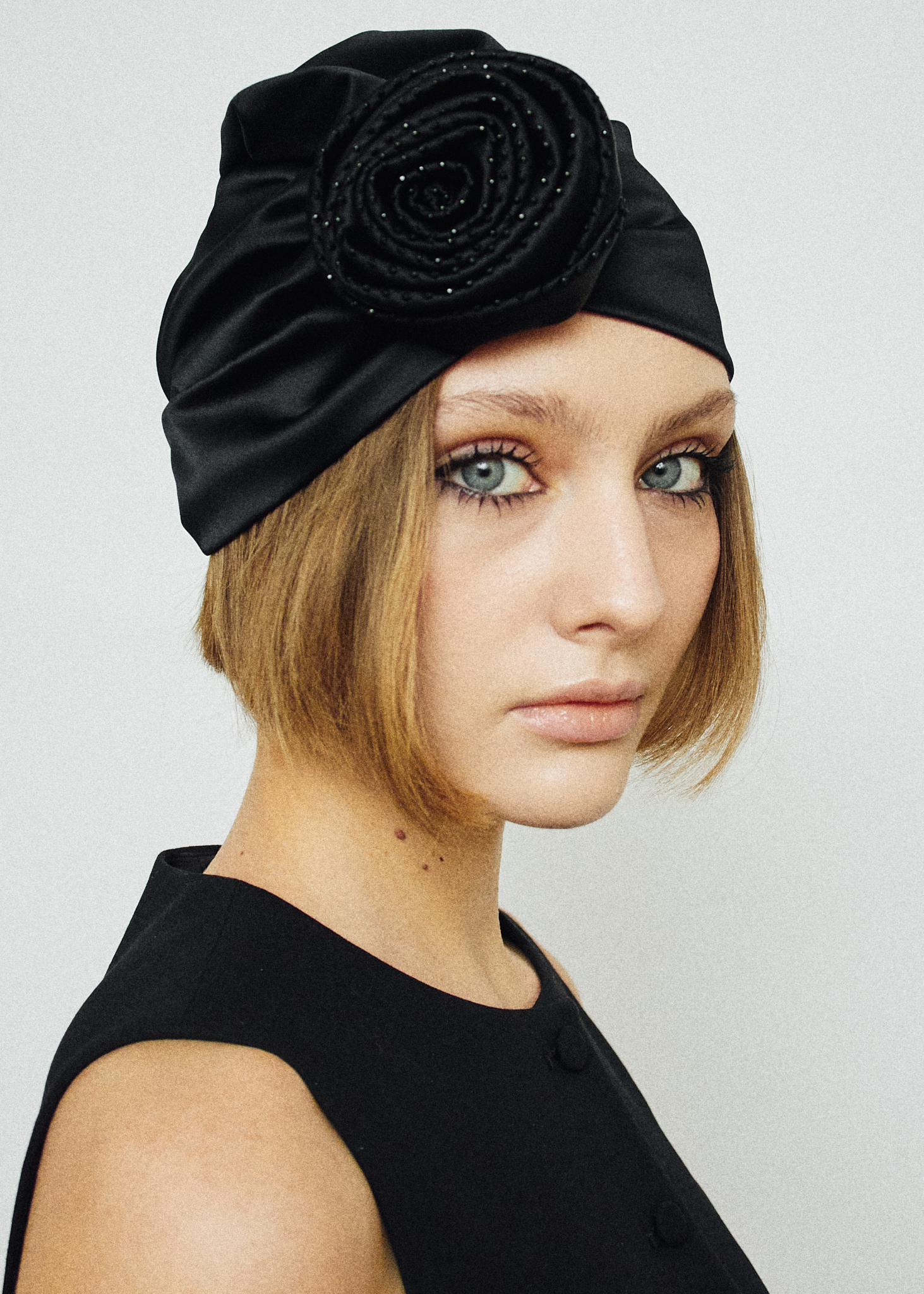 Тюрбан из глянцевого шелкового атласа в черном цвете. Украшен шелковым декором из этого же материала в форме розы и вручную расшит бусинами.