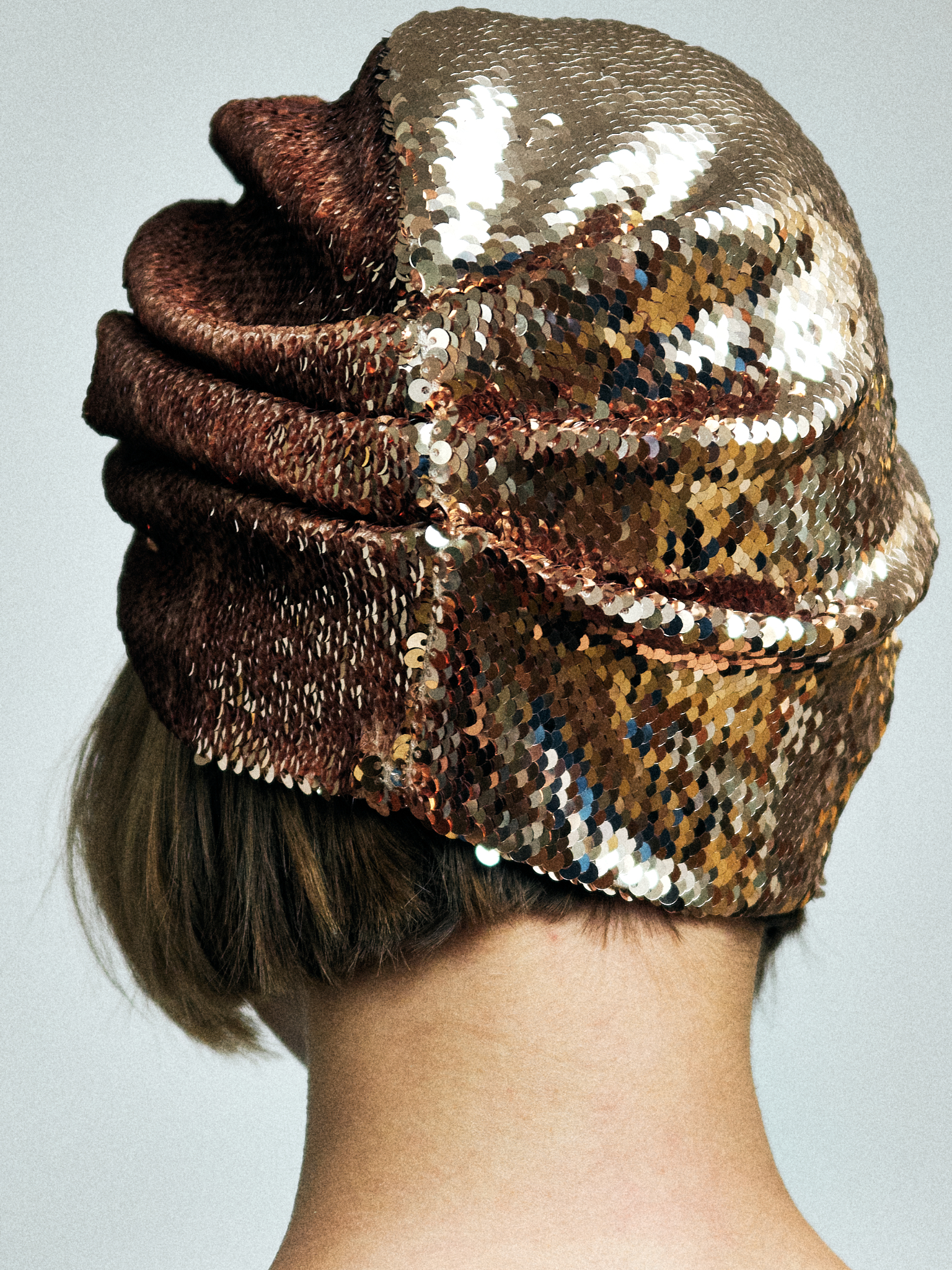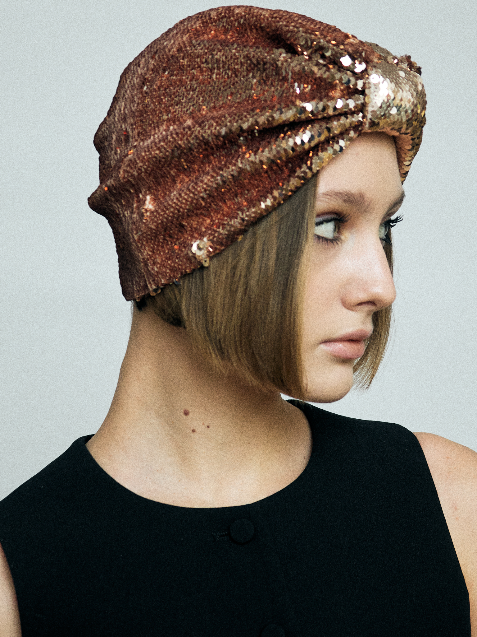 Тюрбан с пайетками золотого цвета, созданный вручную нашими мастерами.