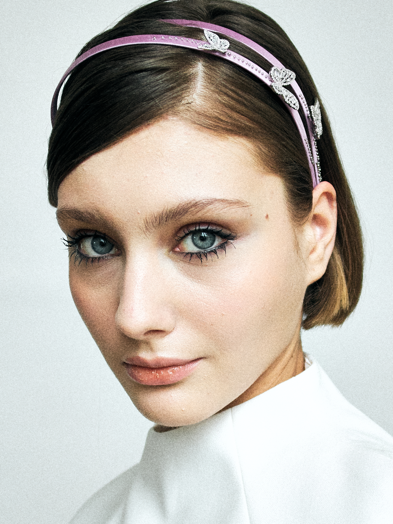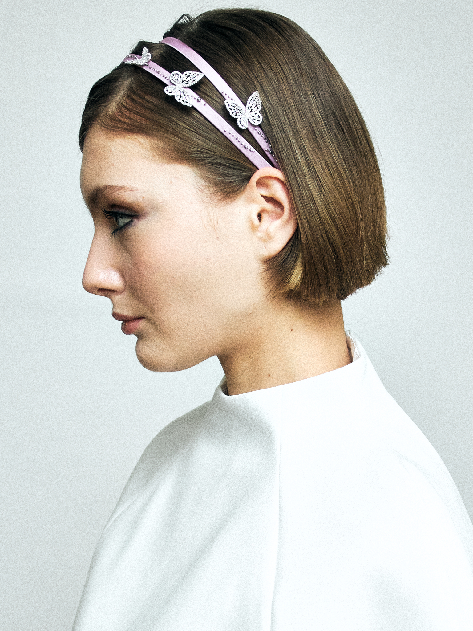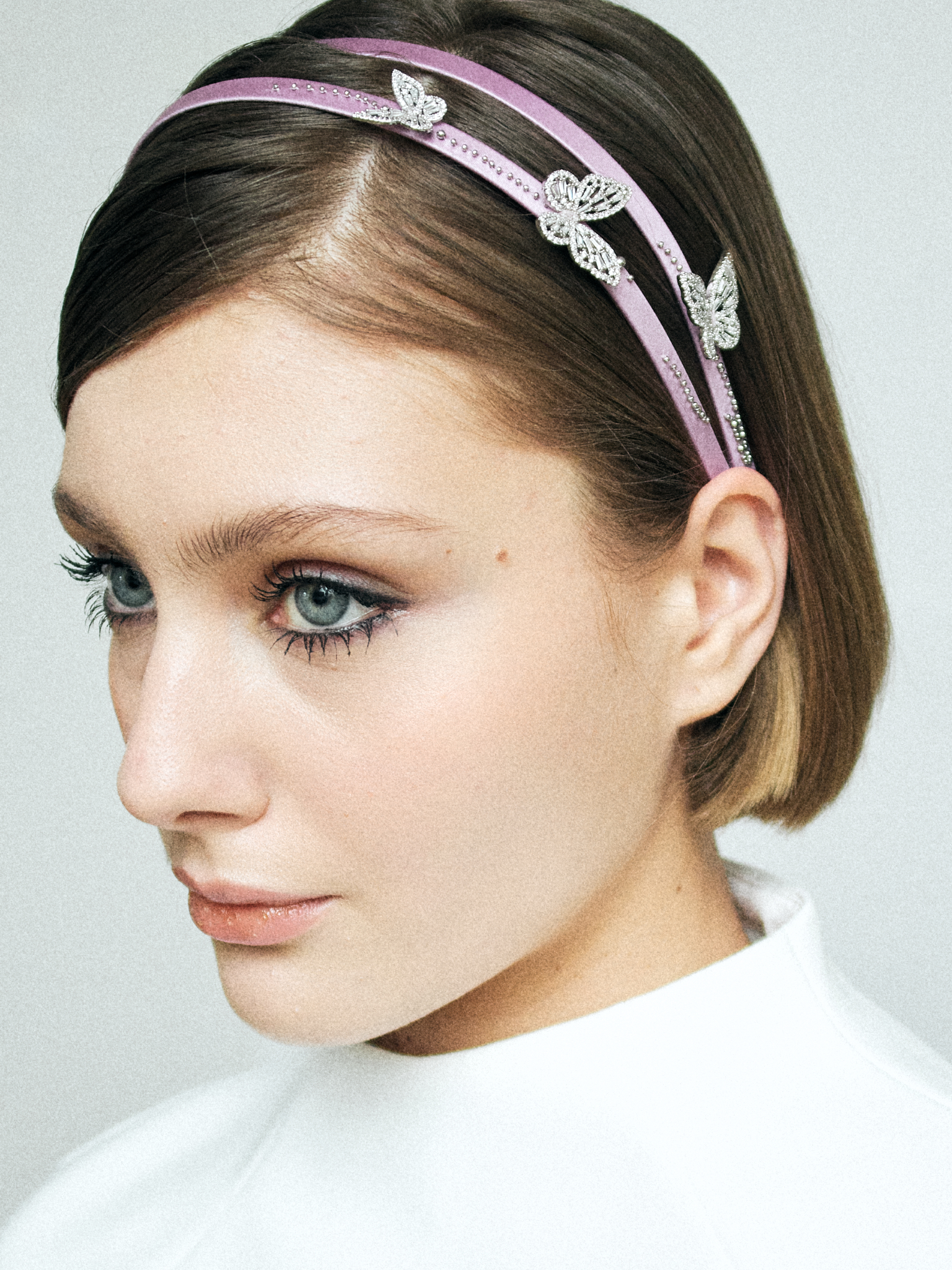 Двойной тонкий ободок из шелкового атласа с деликатным декором в виде бабочек — это про изящество в деталях и утончённую элегантность. Лаконичная форма с двумя тонкими линиями красиво подчёркивает причёску, создавая аккуратный, продуманный акцент, а сверкающие бабочки добавляют образу лёгкость и романтичное настроение. Он смотрится особенно изысканно и современно, идеально дополняя как повседневные, так и более нарядные образы, не перегружая их, а мягко завершая.