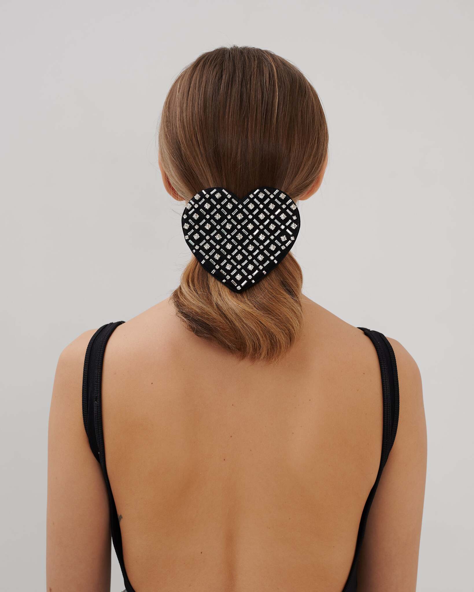 Заколка-сердца из черного шелка узорно расшитая белыми стразами и металом.