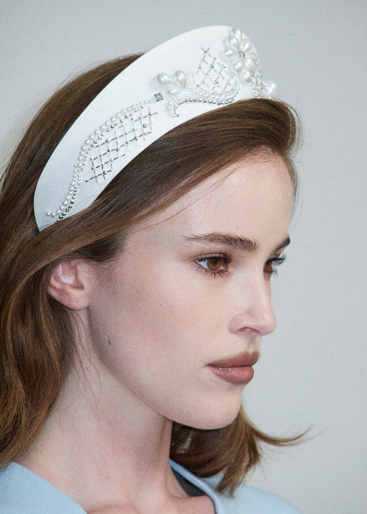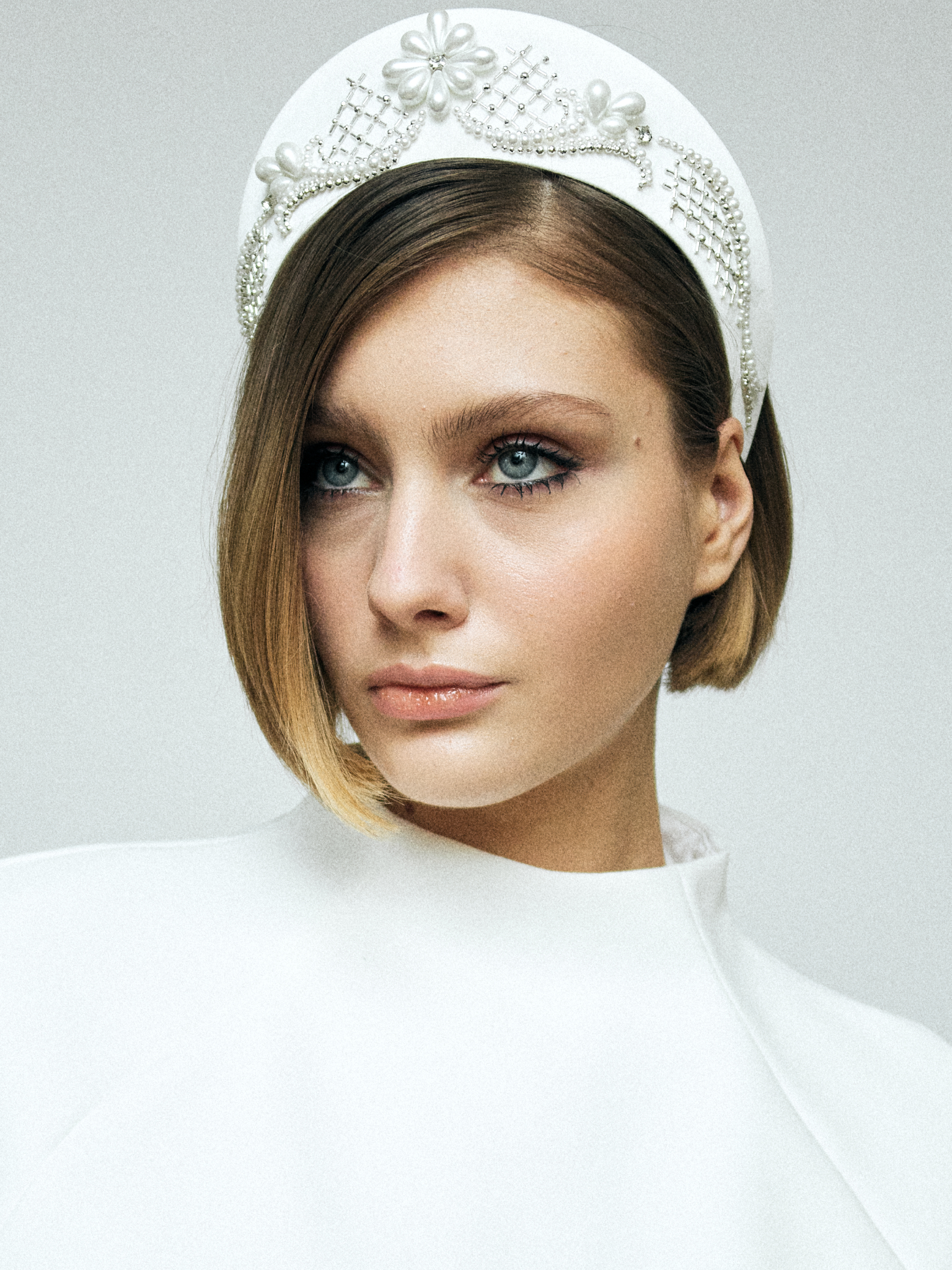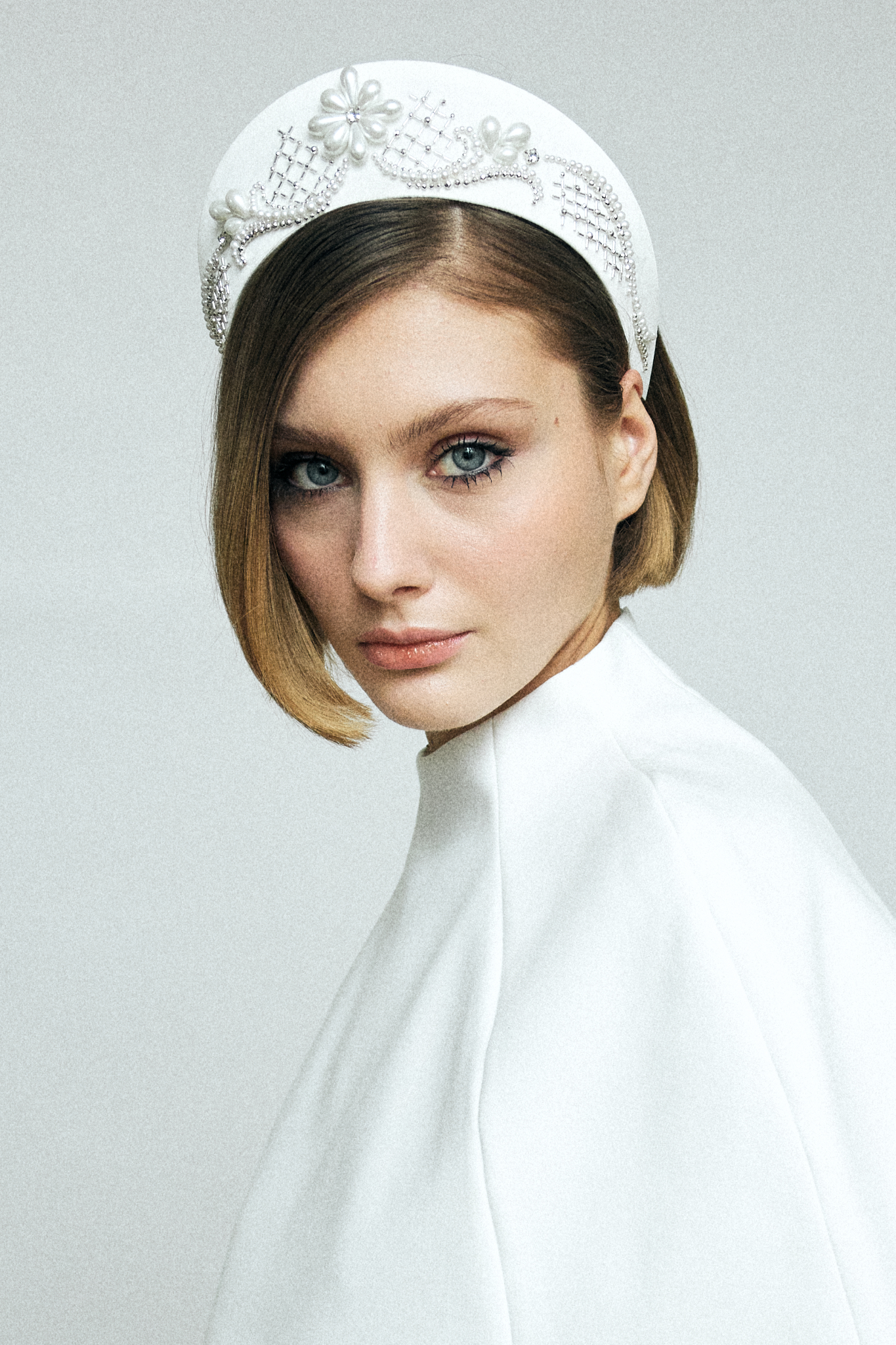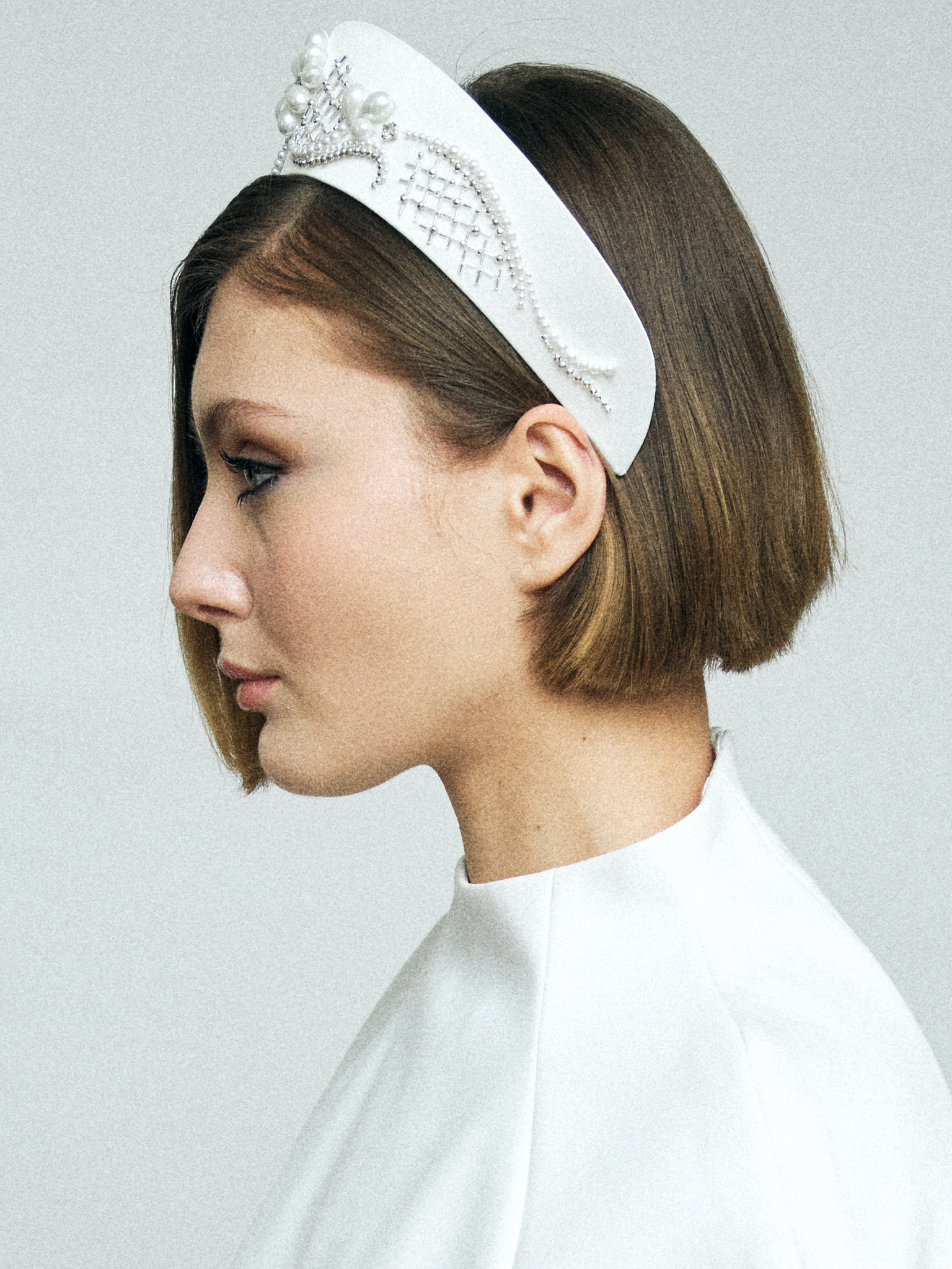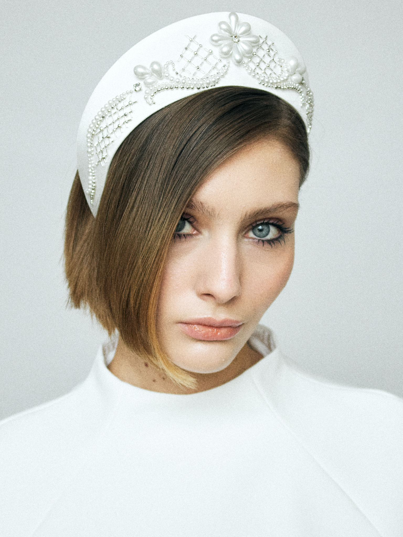 Кокошник из белого атласа размера M, украшенный жемчугом, серебристым японским стеклярусом и бусинами, формирующими изящную сетку, — это сочетание традиции и современной геометрии.