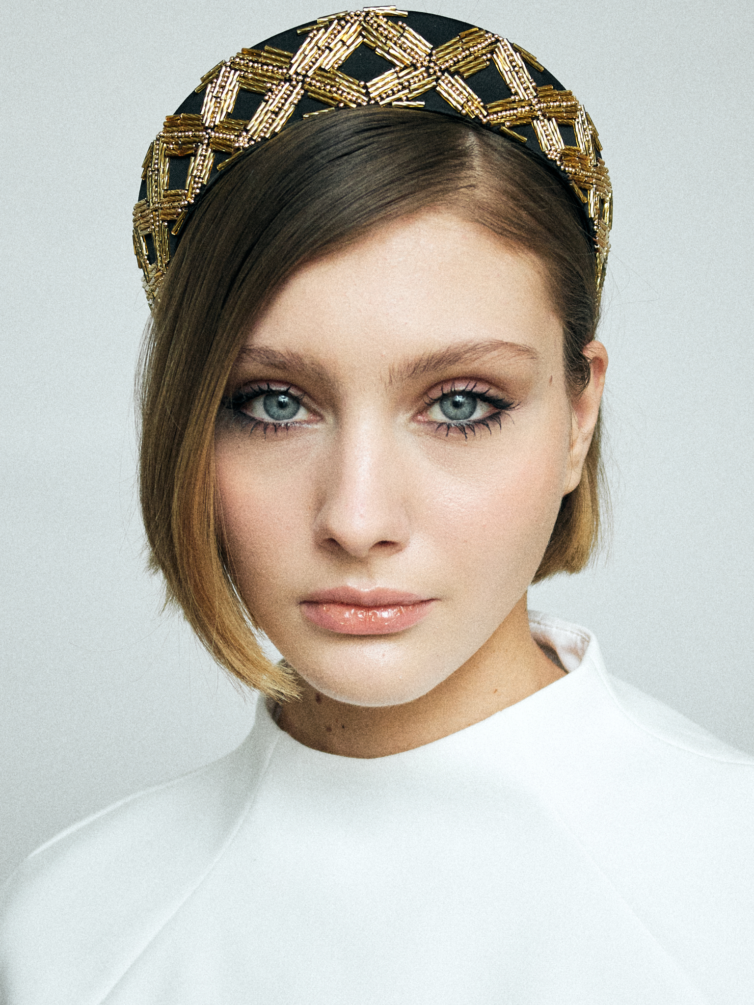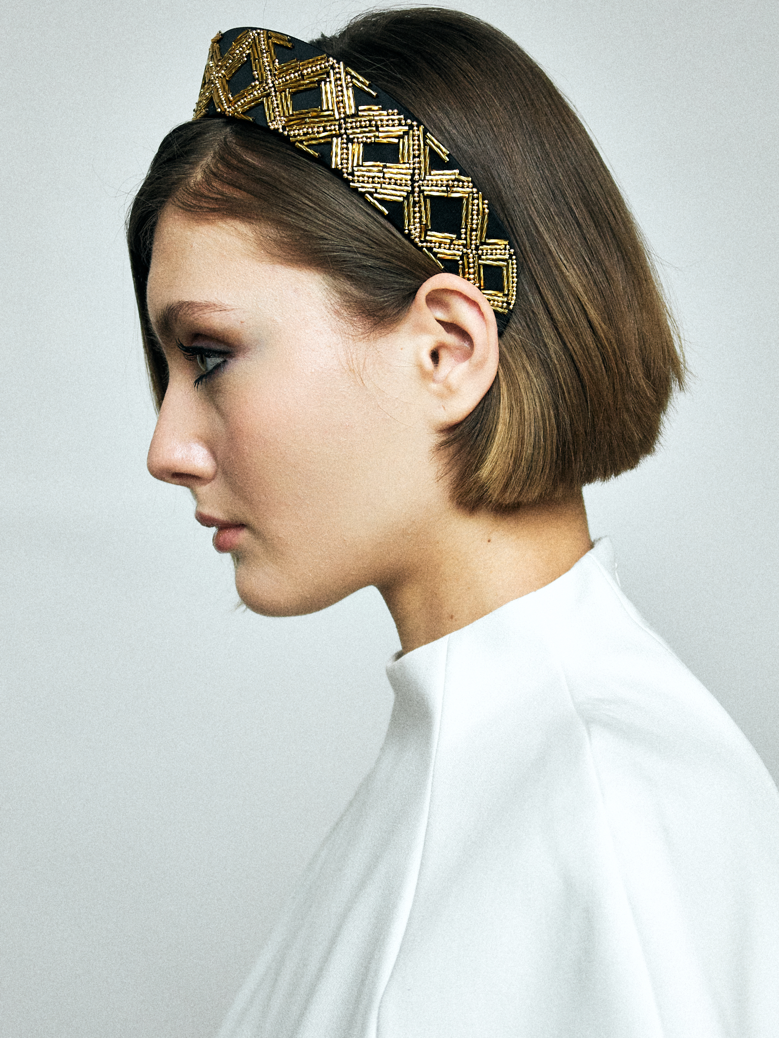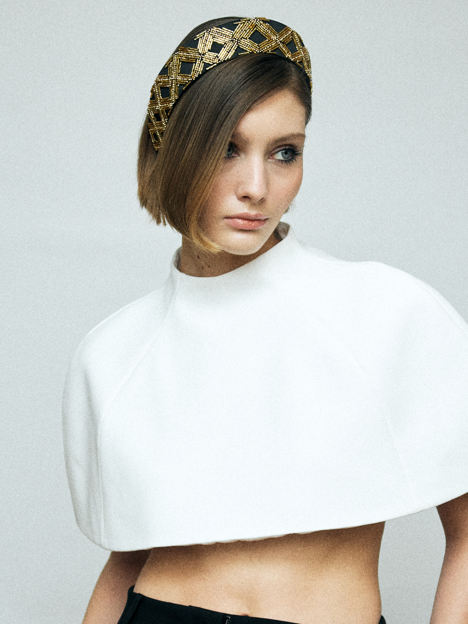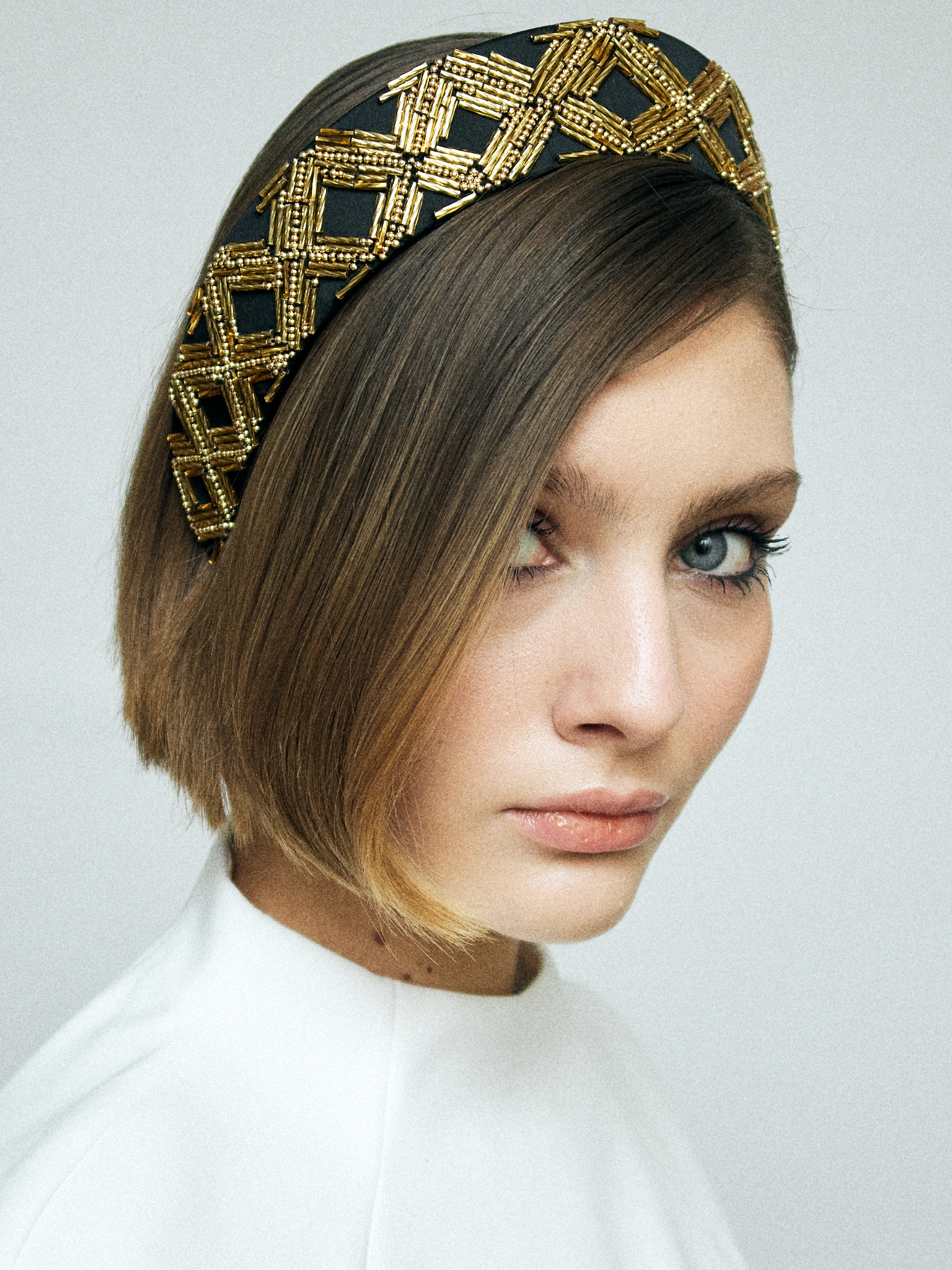 Кокошник из шелкового атласа с вышивкой из золотого японского стекляруса — это не про декоративность, а про форму и характер: чёткая геометрия узора создаёт выразительный силуэт, а деликатное мерцание работает в движении, не перегружая образ; мы сделали его так, чтобы он держал баланс между традицией и современностью и выглядел как самостоятельное украшение, а не дополнение.