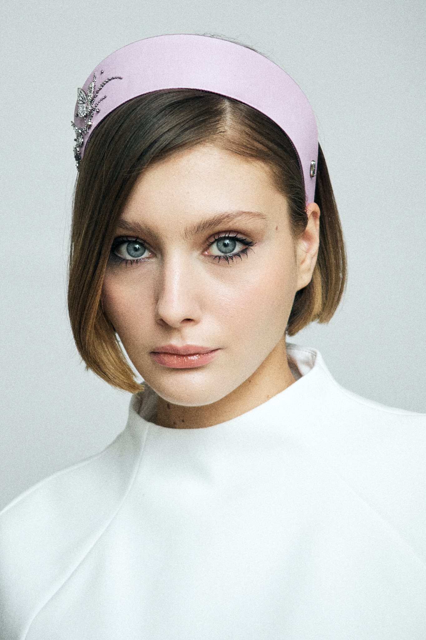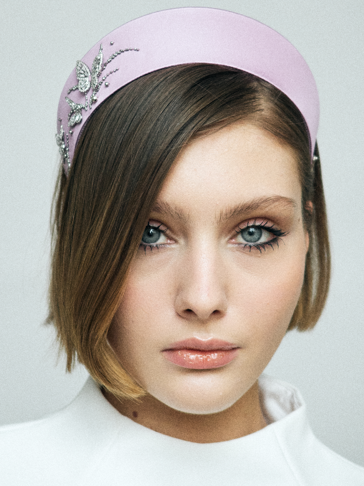 Кокошник в размере S выполнен из шелкового атласа в сиреневом цвете и украшен фигурными бабочками из камней.
