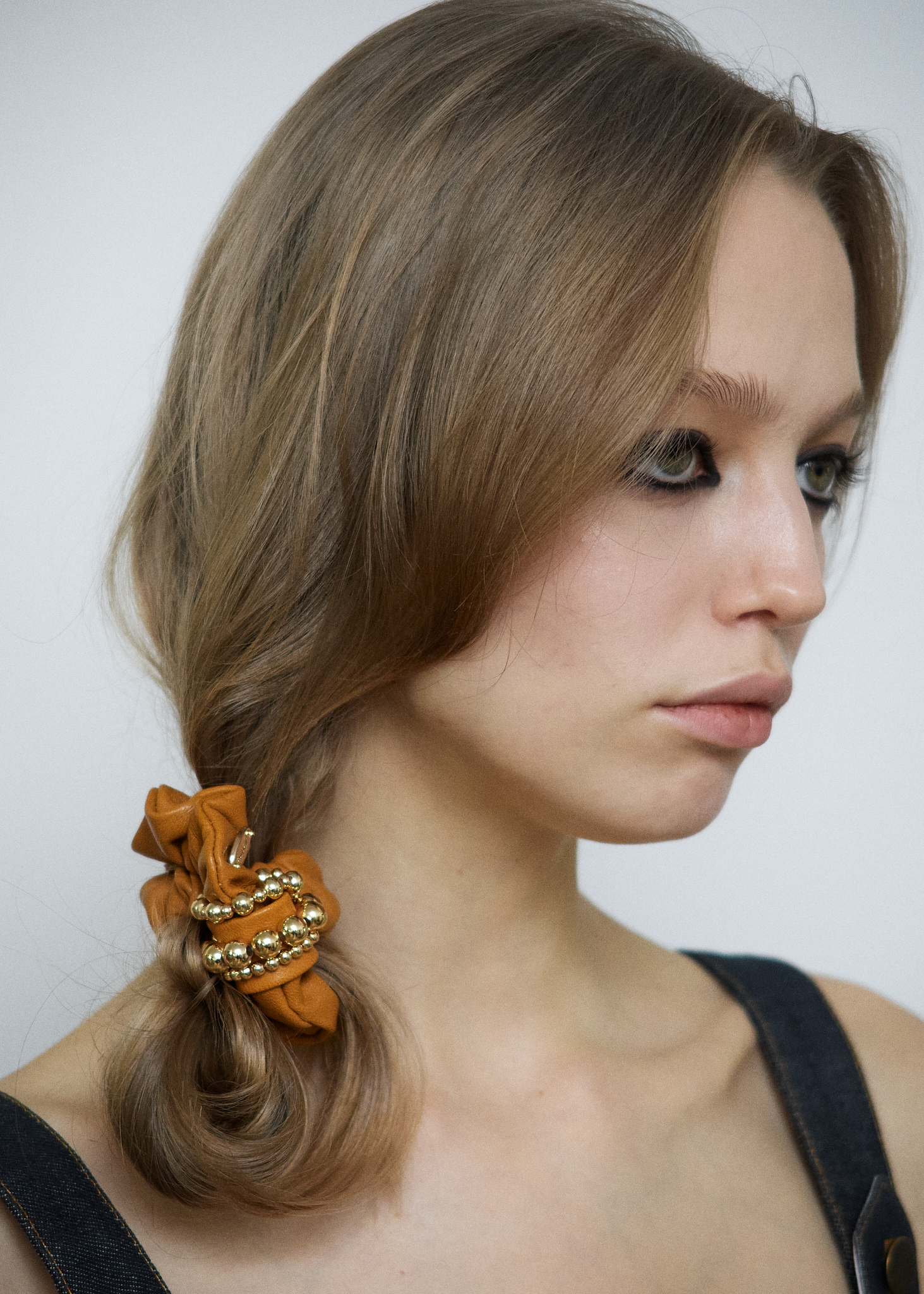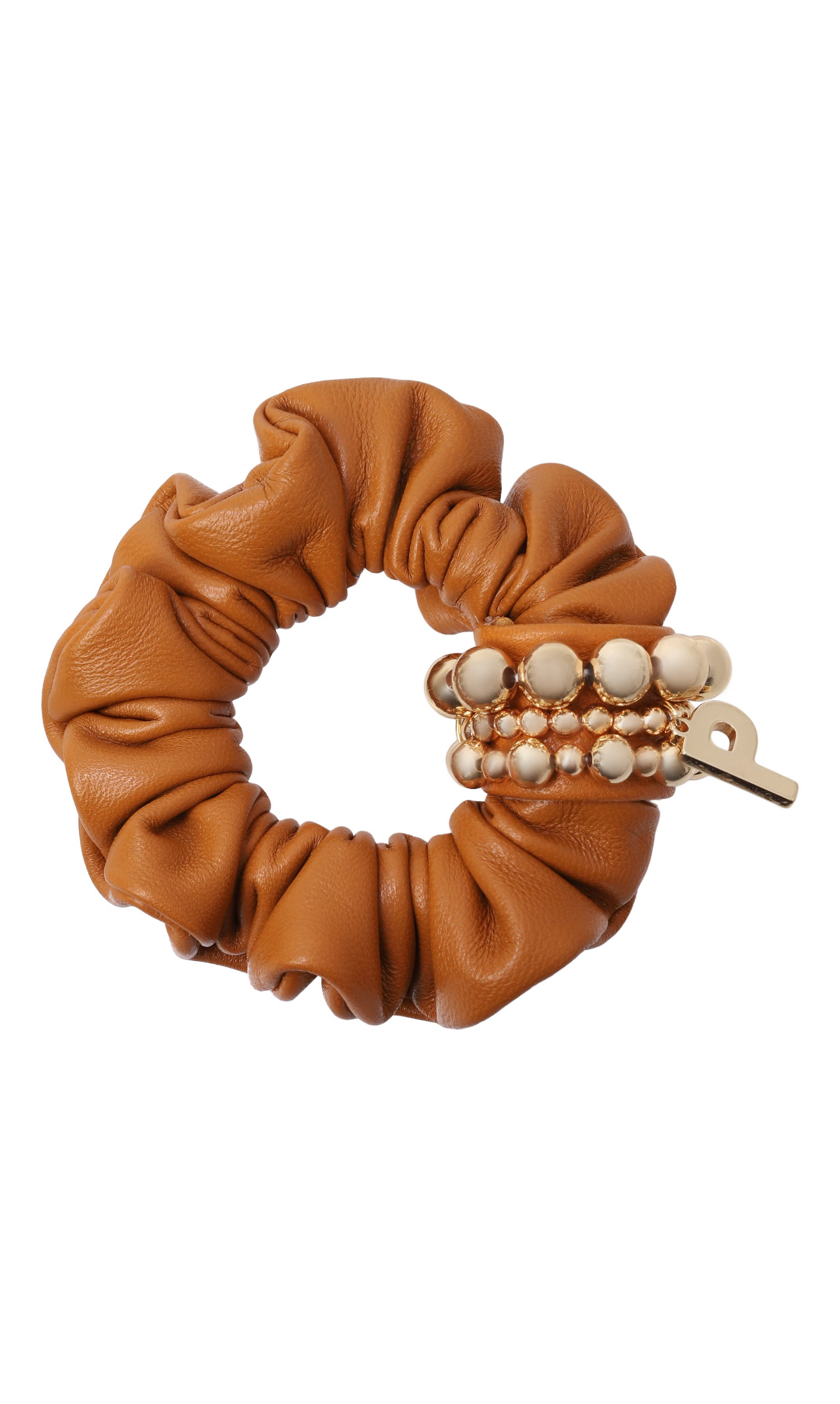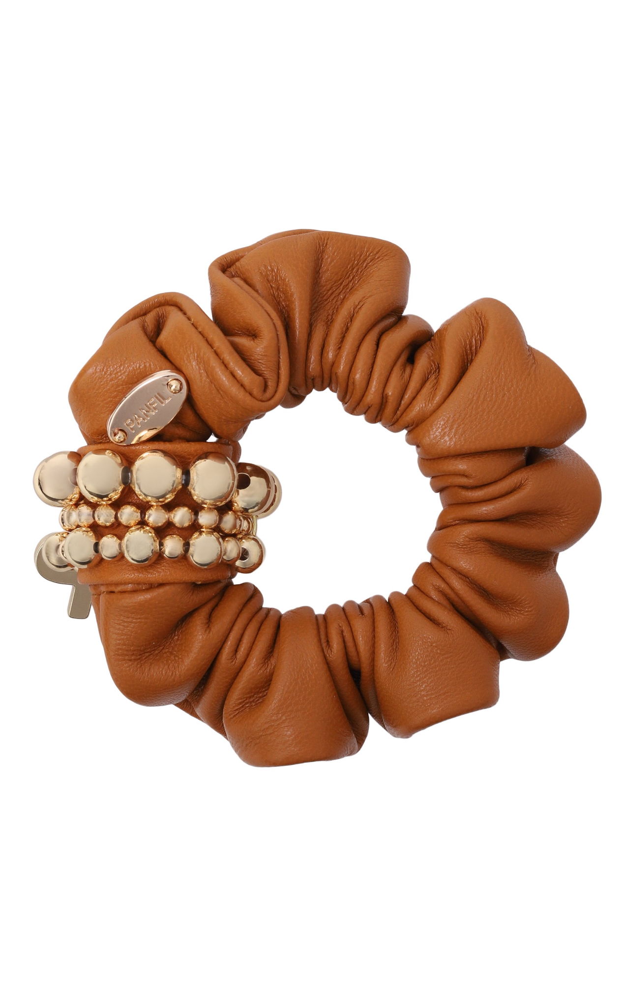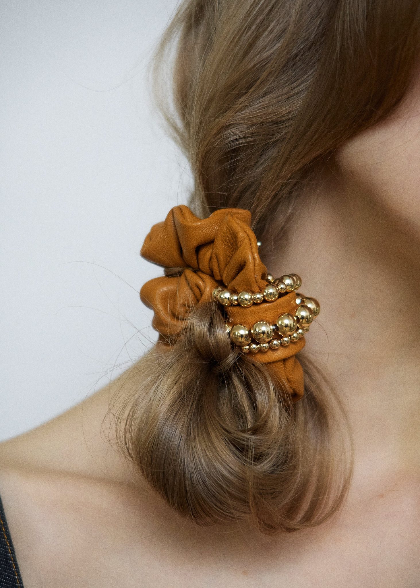 Резинка из натуральной кожи оранжевого цвета дополненная бусинами и логотипом бренда, резинка выполнена вручную нашими мастерами.