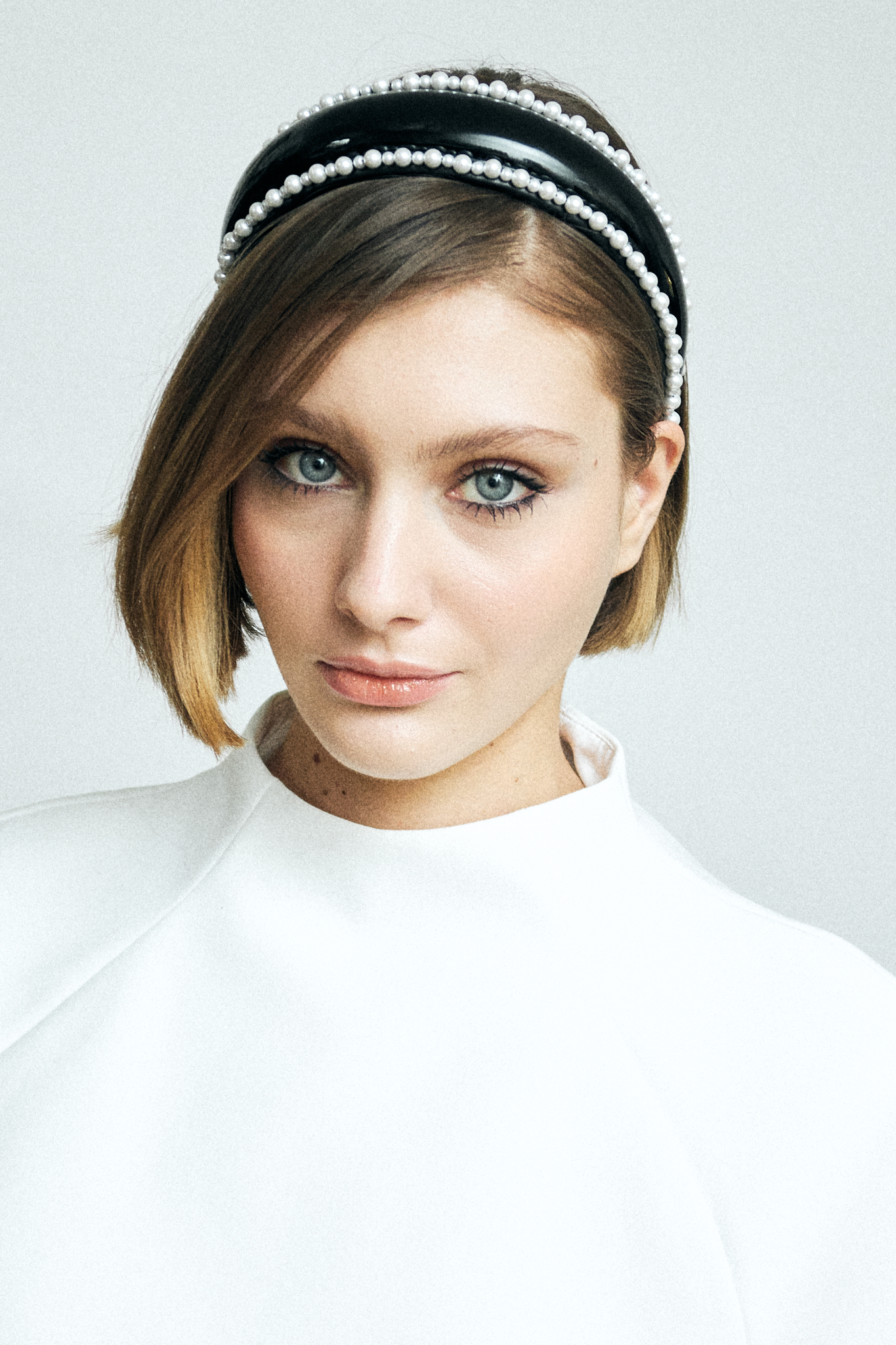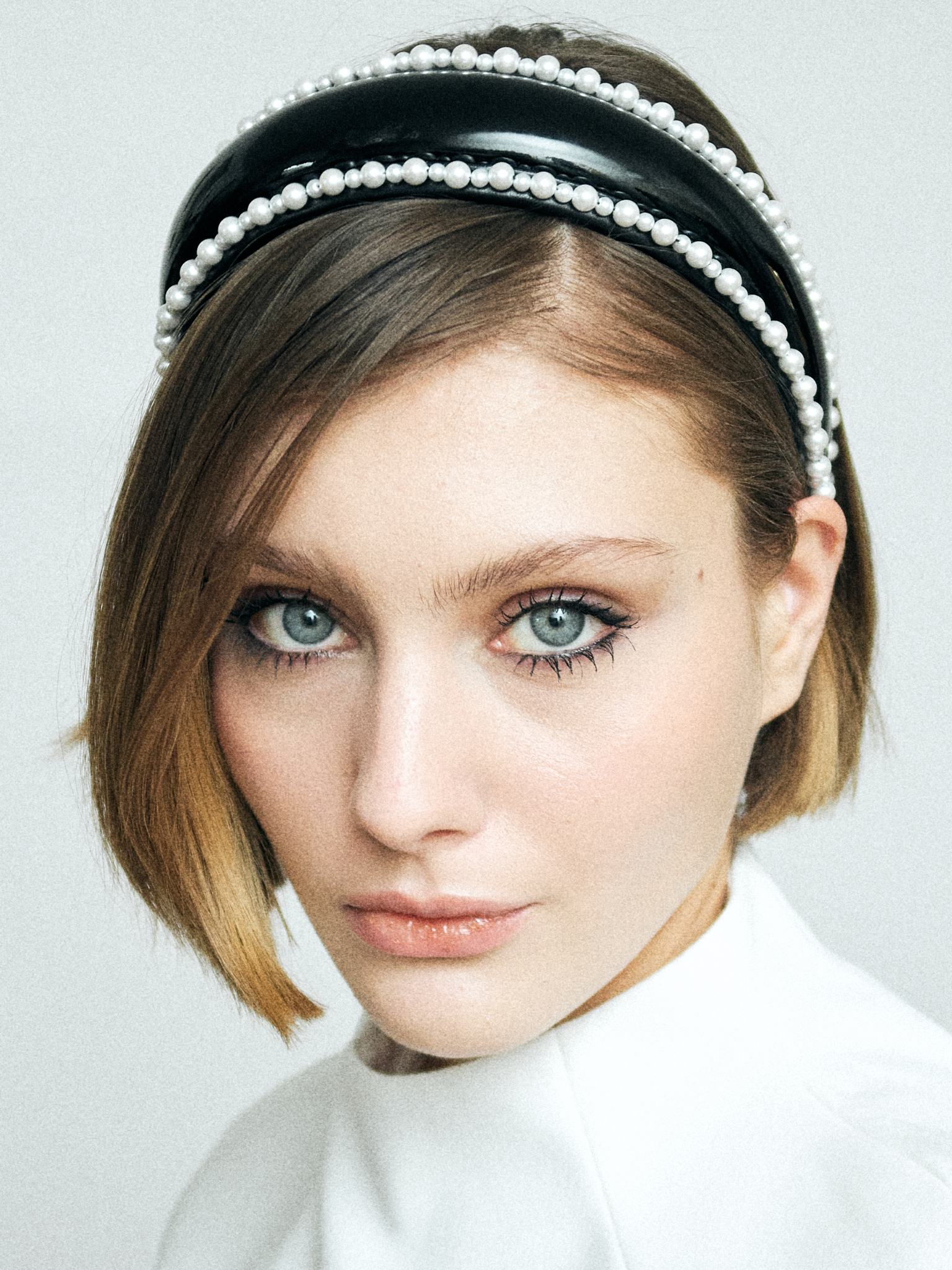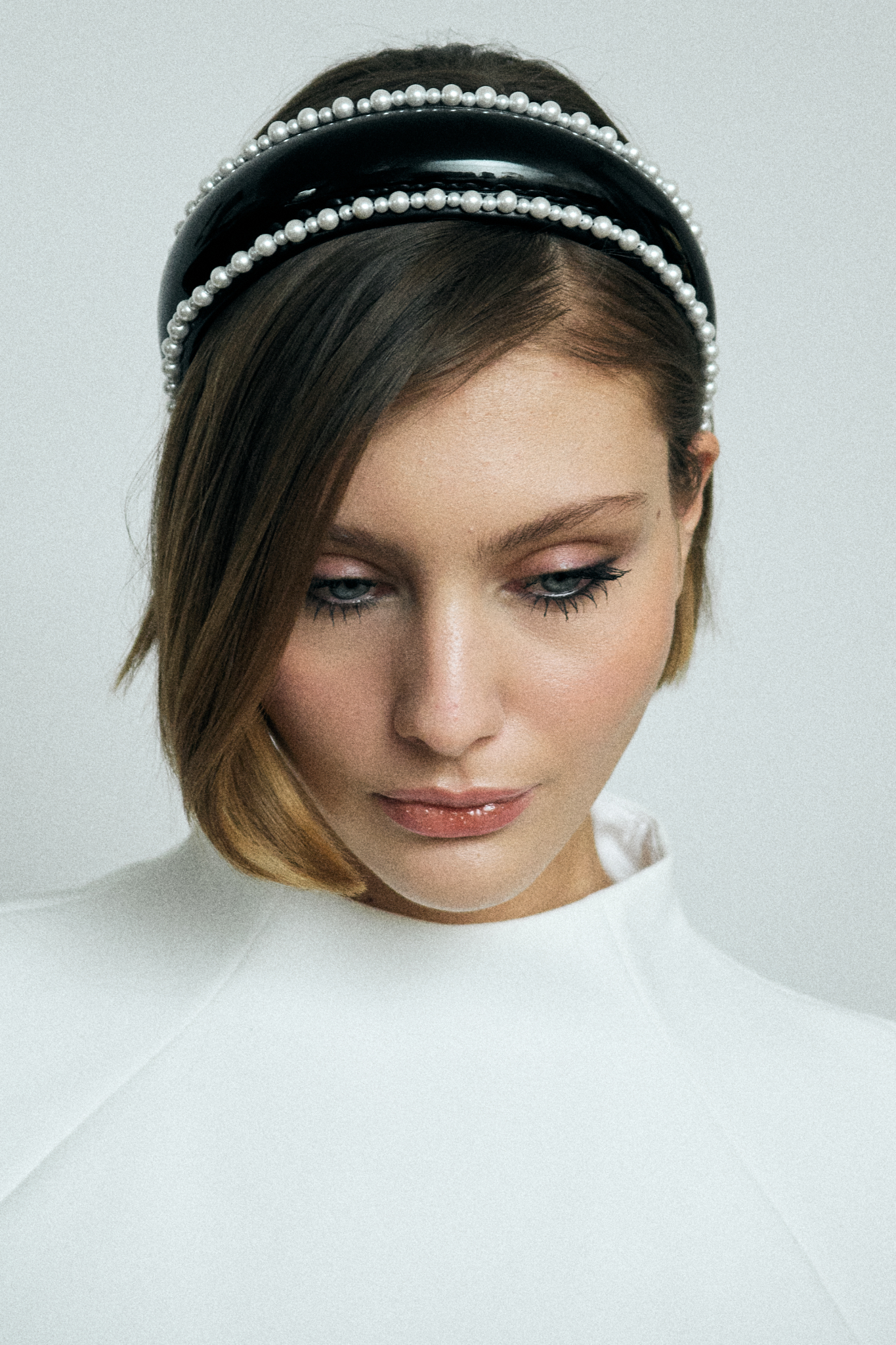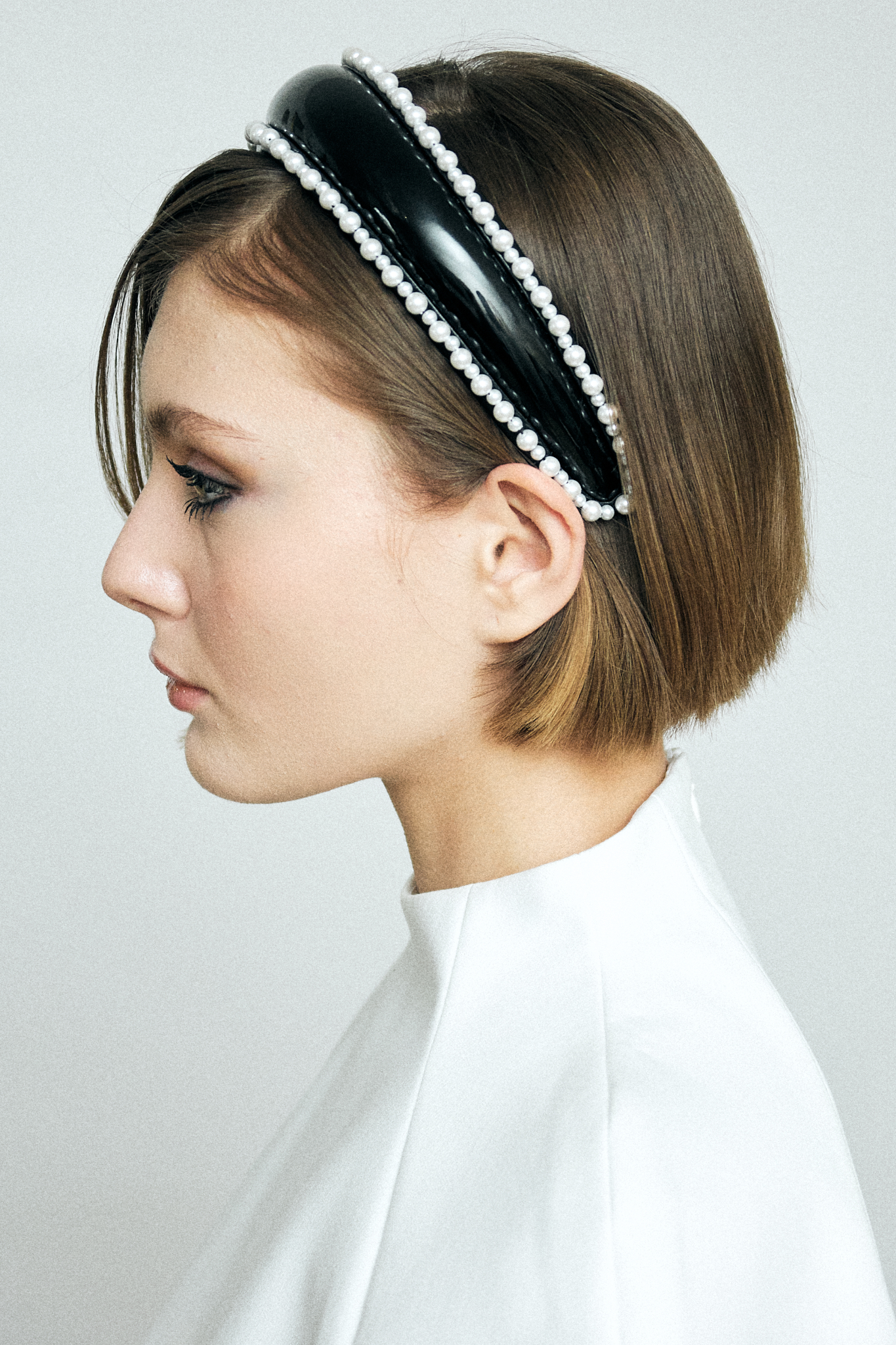 Объёмный ободок из лакированной кожи с отделкой жемчугом по контуру — это про контраст и форму: гладкий глянец создаёт чёткий, выразительный силуэт, а линия жемчуга добавляет мягкость и ритм, удерживая баланс; мы сделали его как акцентное украшение, которое не дополняет образ, а собирает его вокруг себя.