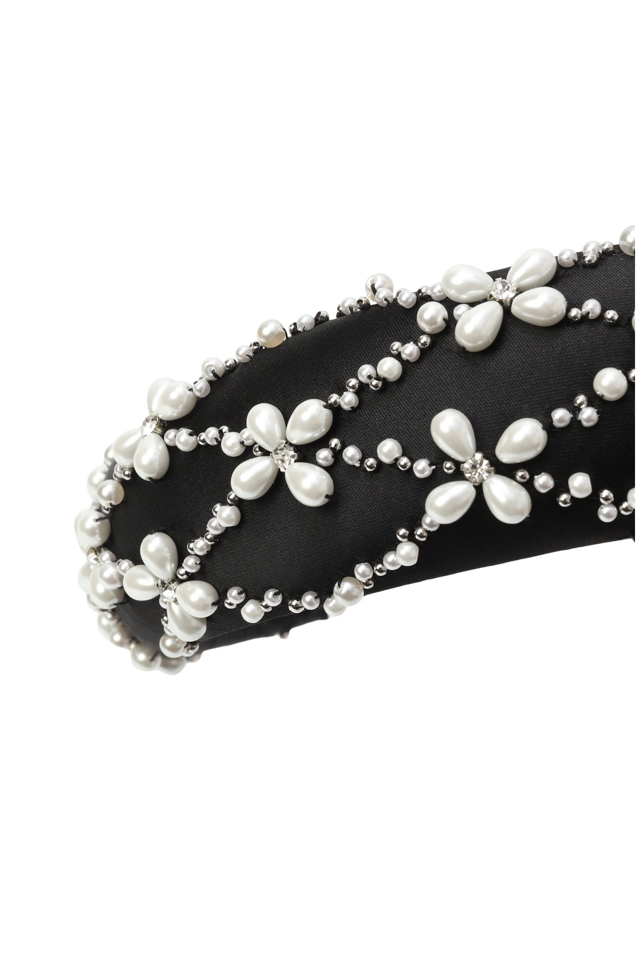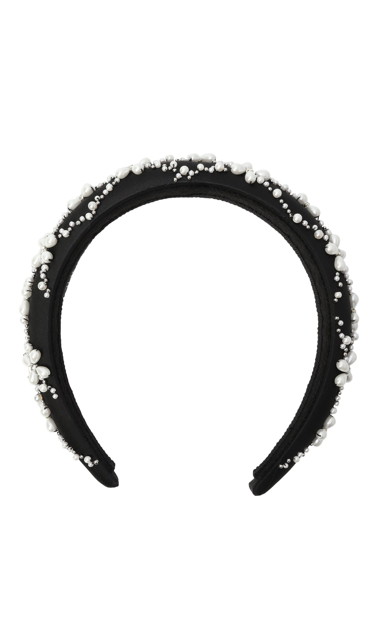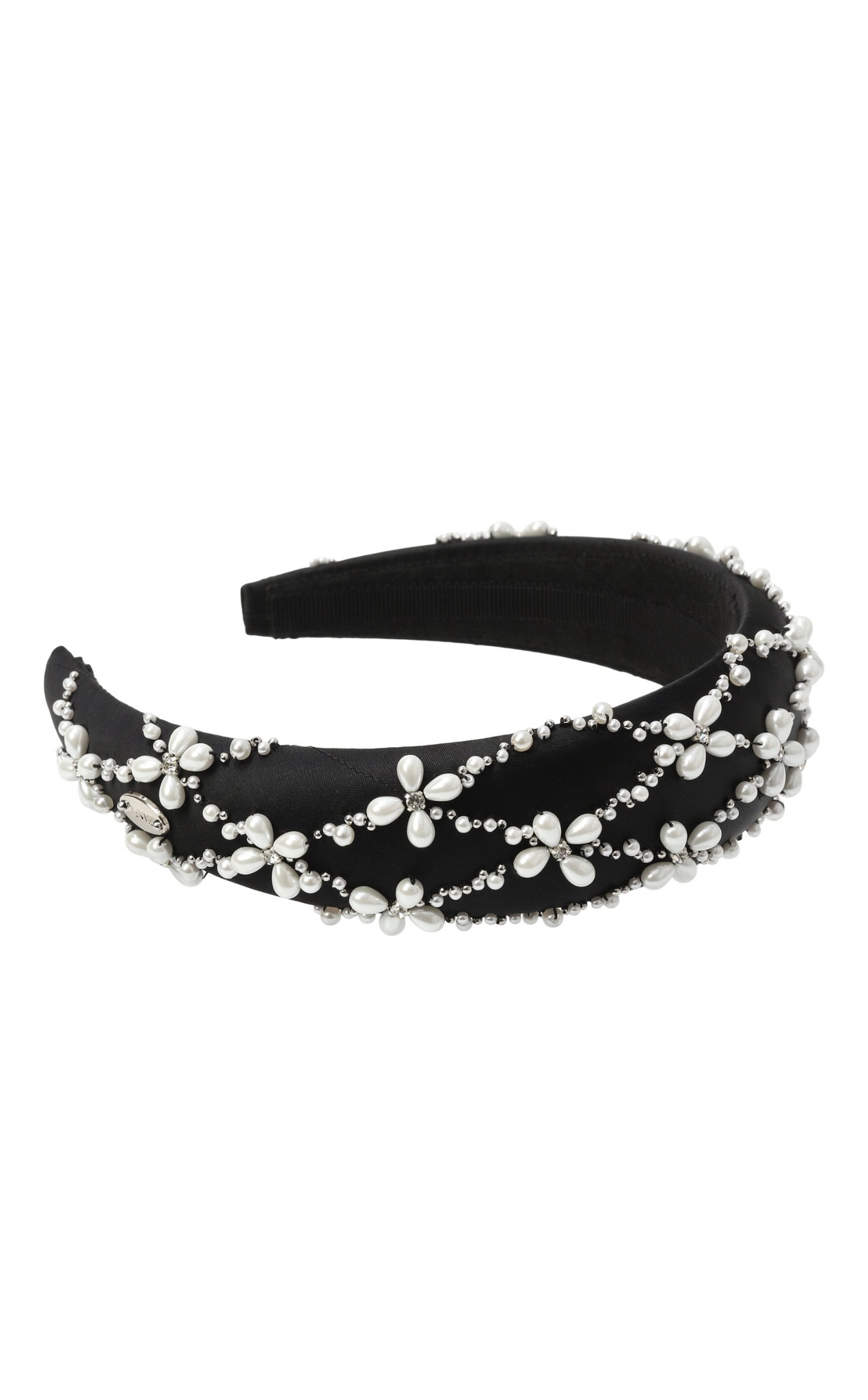 Изысканный ободок ручной работы, созданный из черного шелкового атласа и украшенный жемчужными бусинами, выложенными в изящный узор-сетку. Этот аксессуар — воплощение элегантности и утонченности, идеально дополняющий как вечерние, так и повседневные образы.