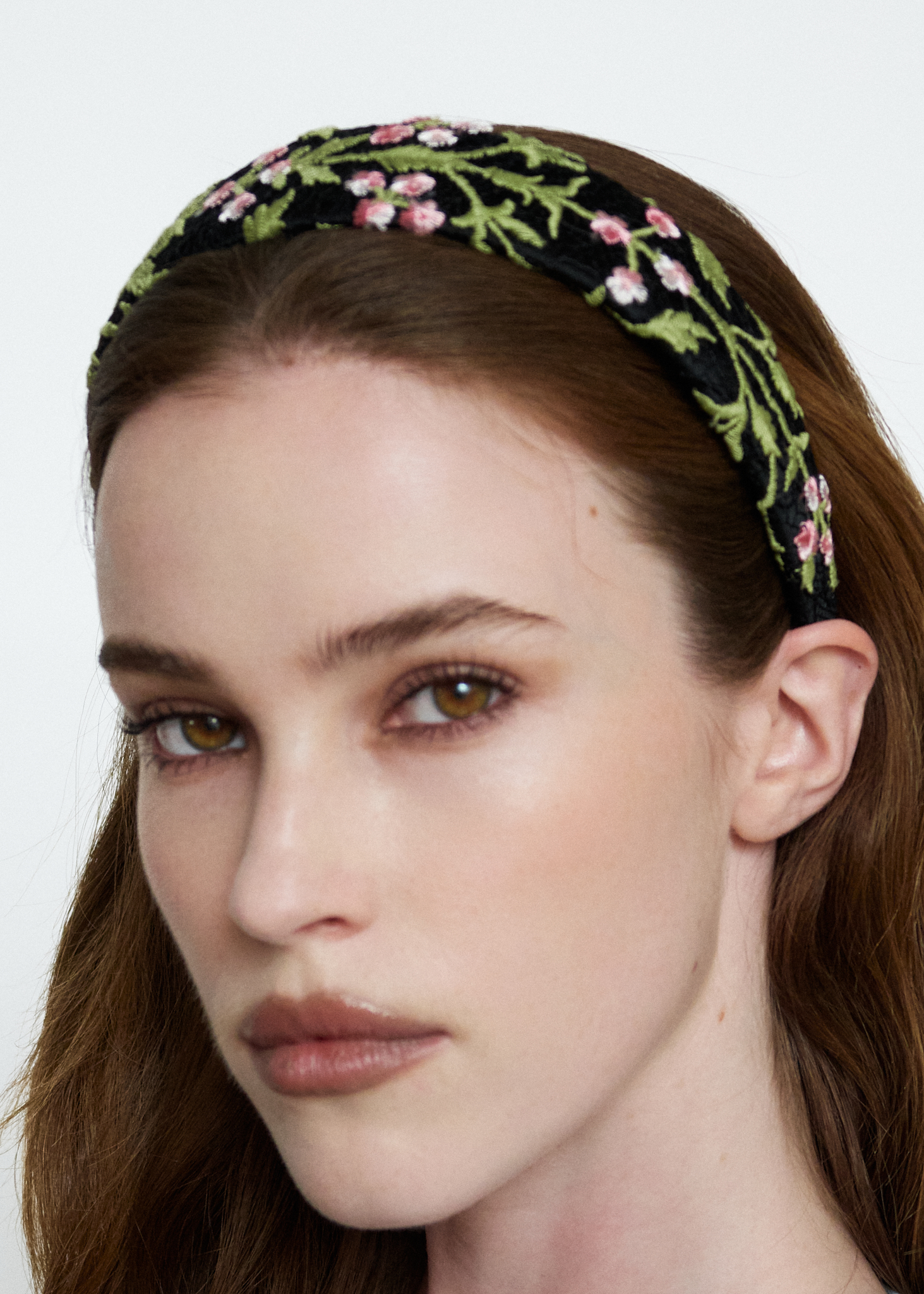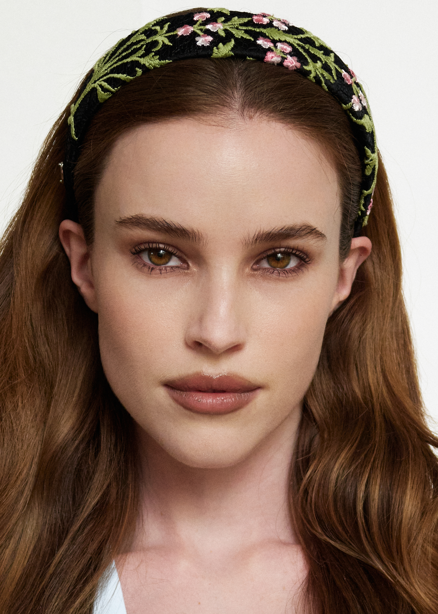 Плоский широкий ободок из утончённого французского кружева — это лёгкость, свежесть и настроение весны в каждой детали. Изящный цветочный орнамент мягко обрамляет лицо, добавляя образу нежности и утончённости.