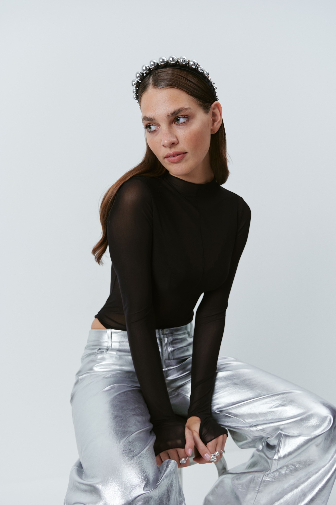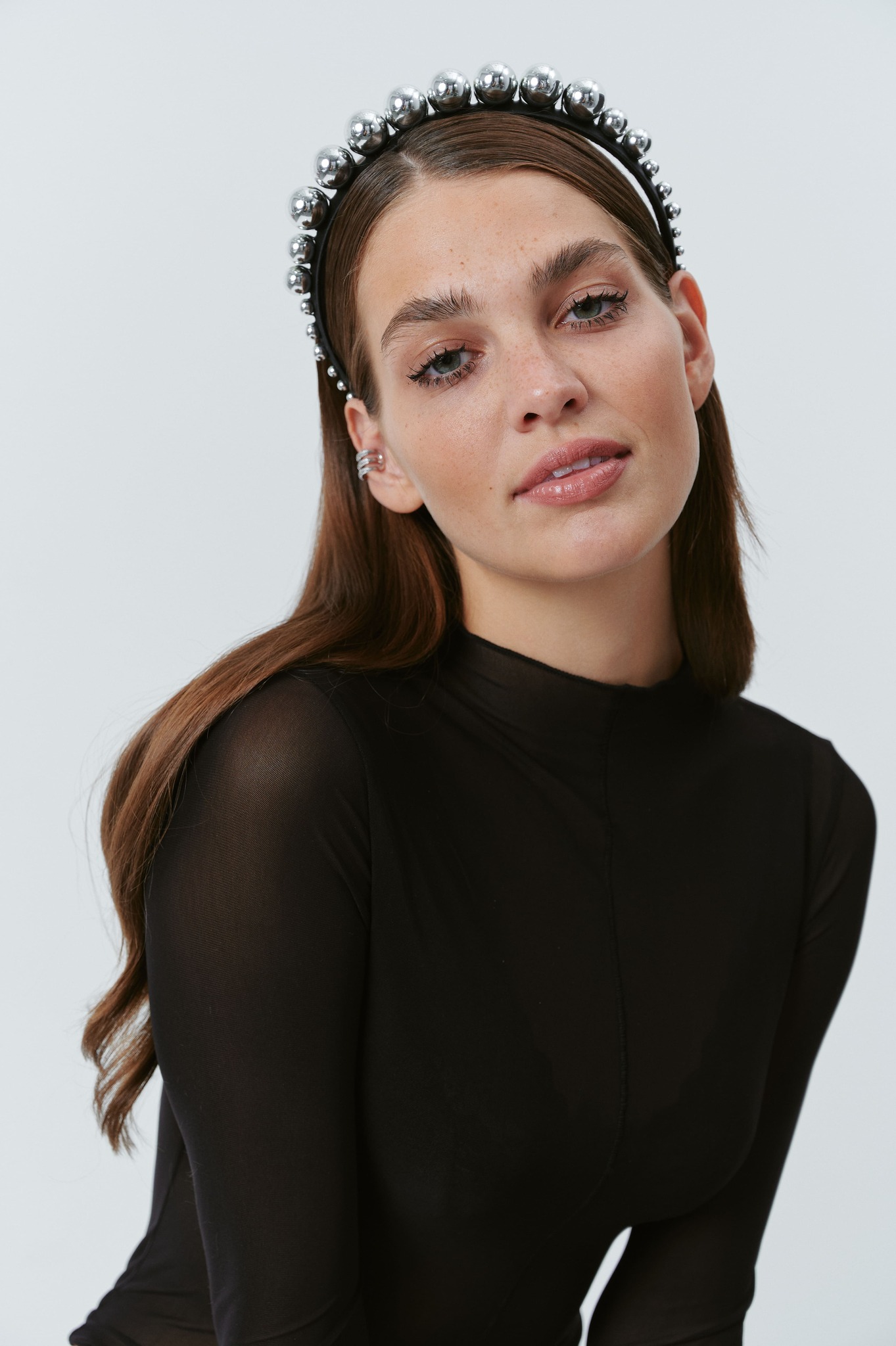 Тонкий ободок из черного атласа украшен металиическими шарами вряд.