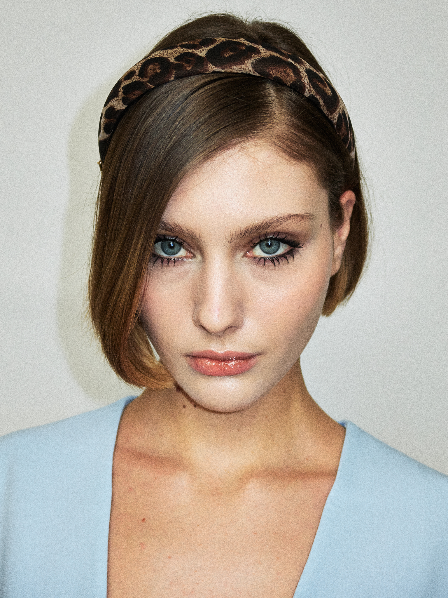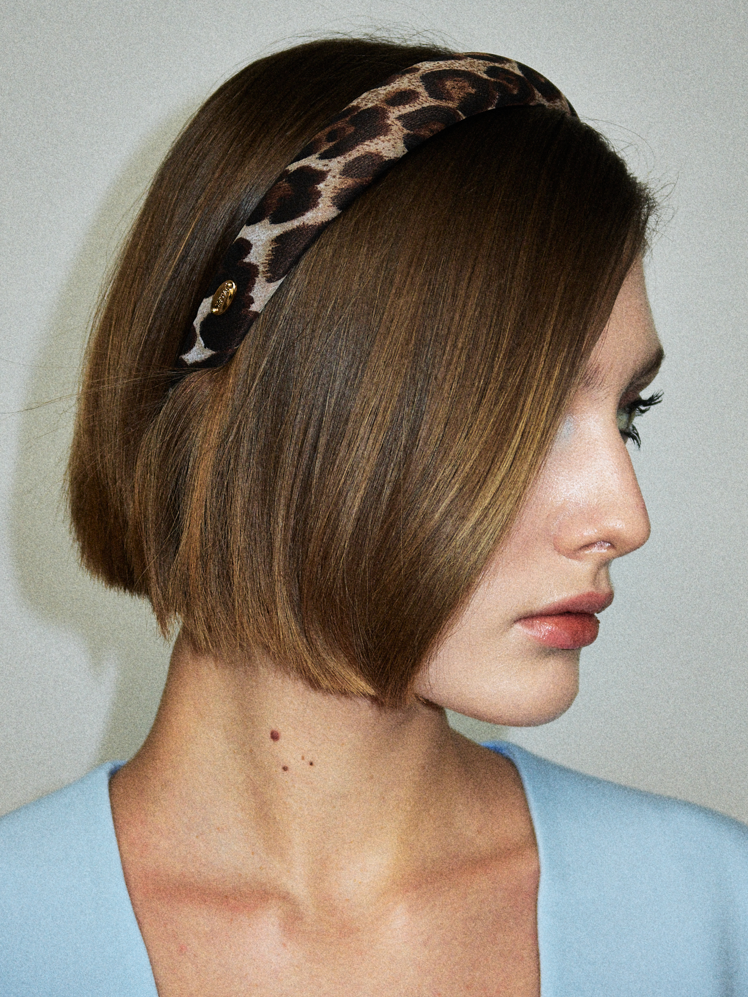 Средний ободок выполнен из шелкового атласа бежевого цвета и обтянут шелком с леопардовым принтом. Идеальная модель для образов с тренчом или свитером.