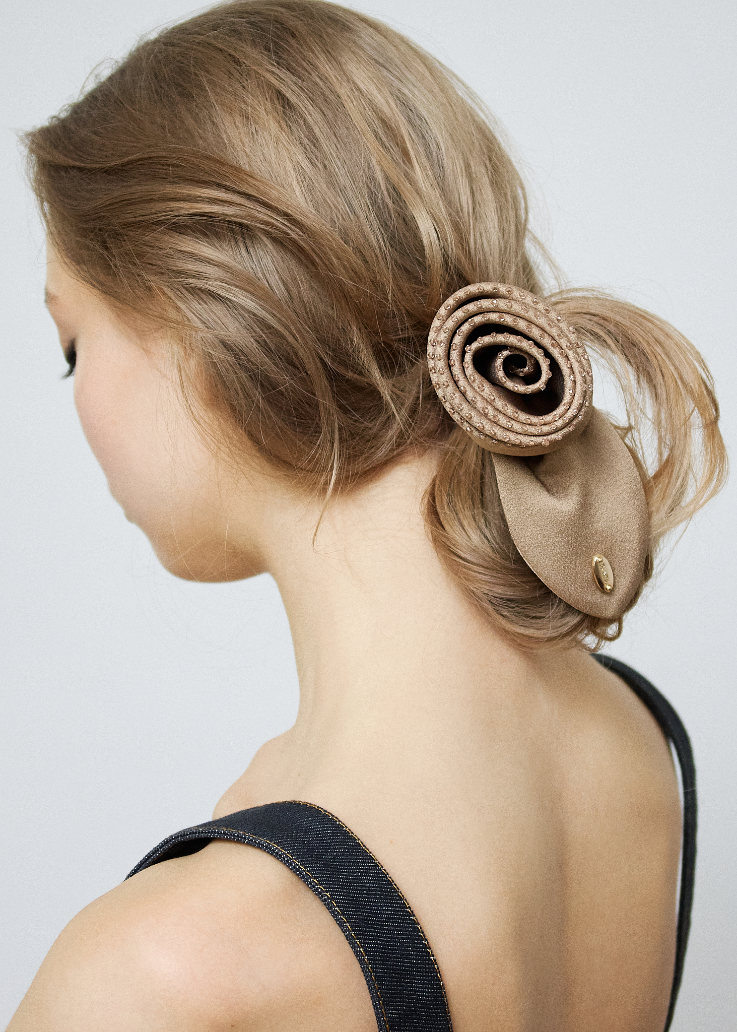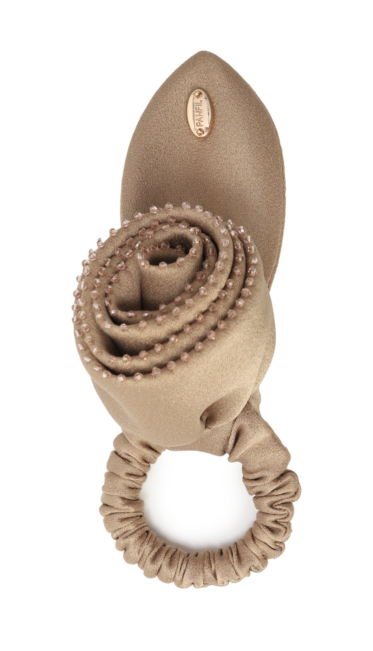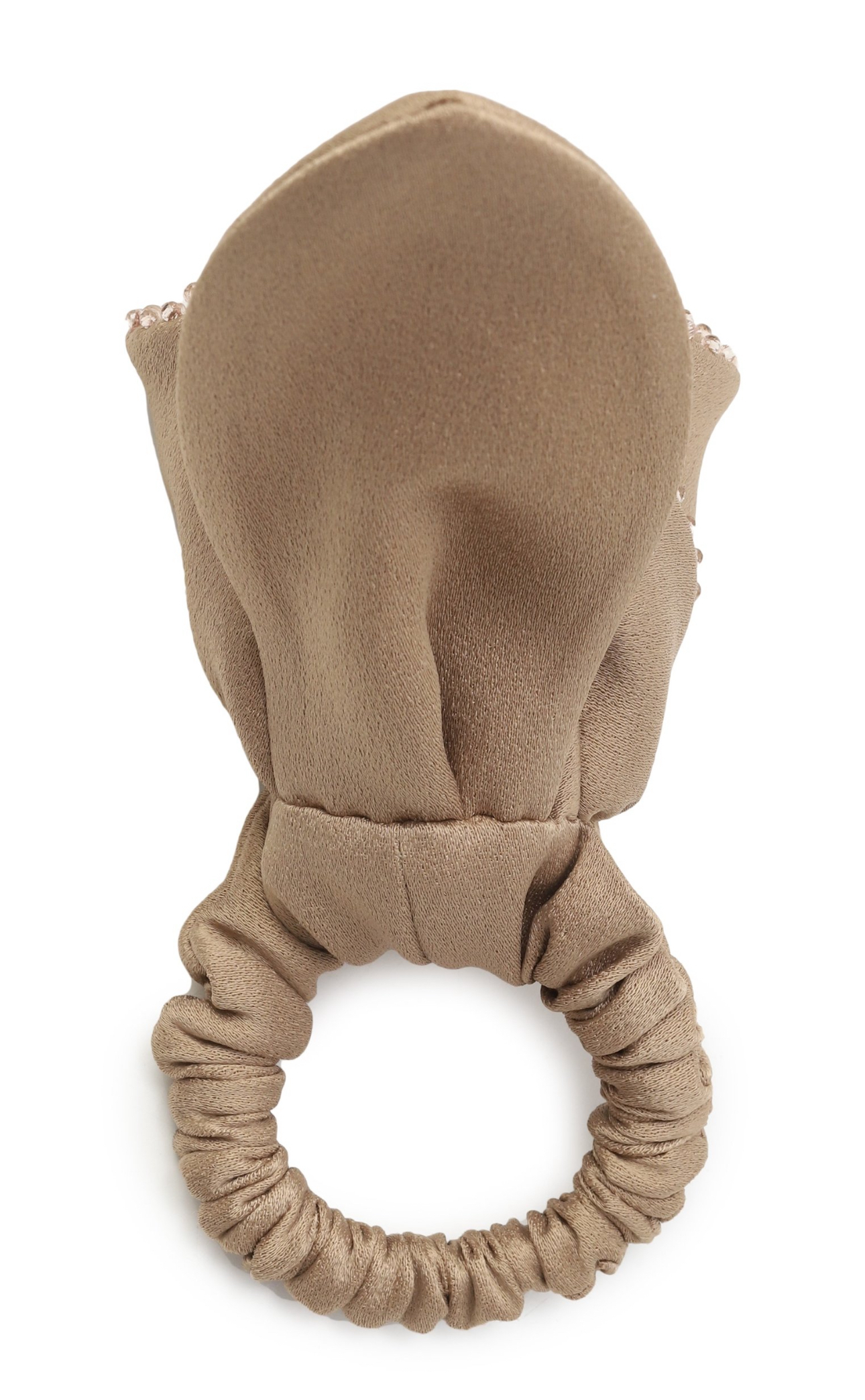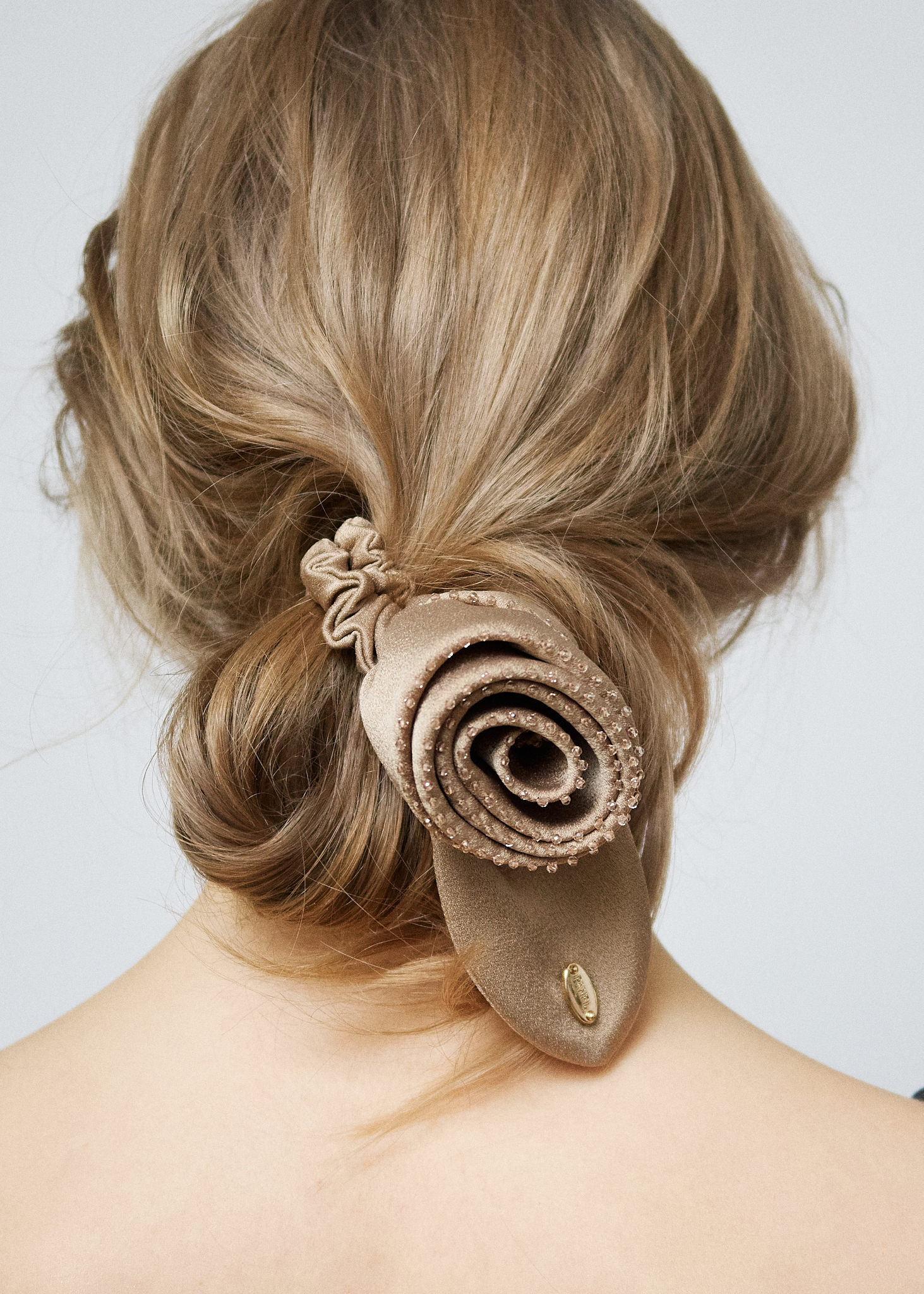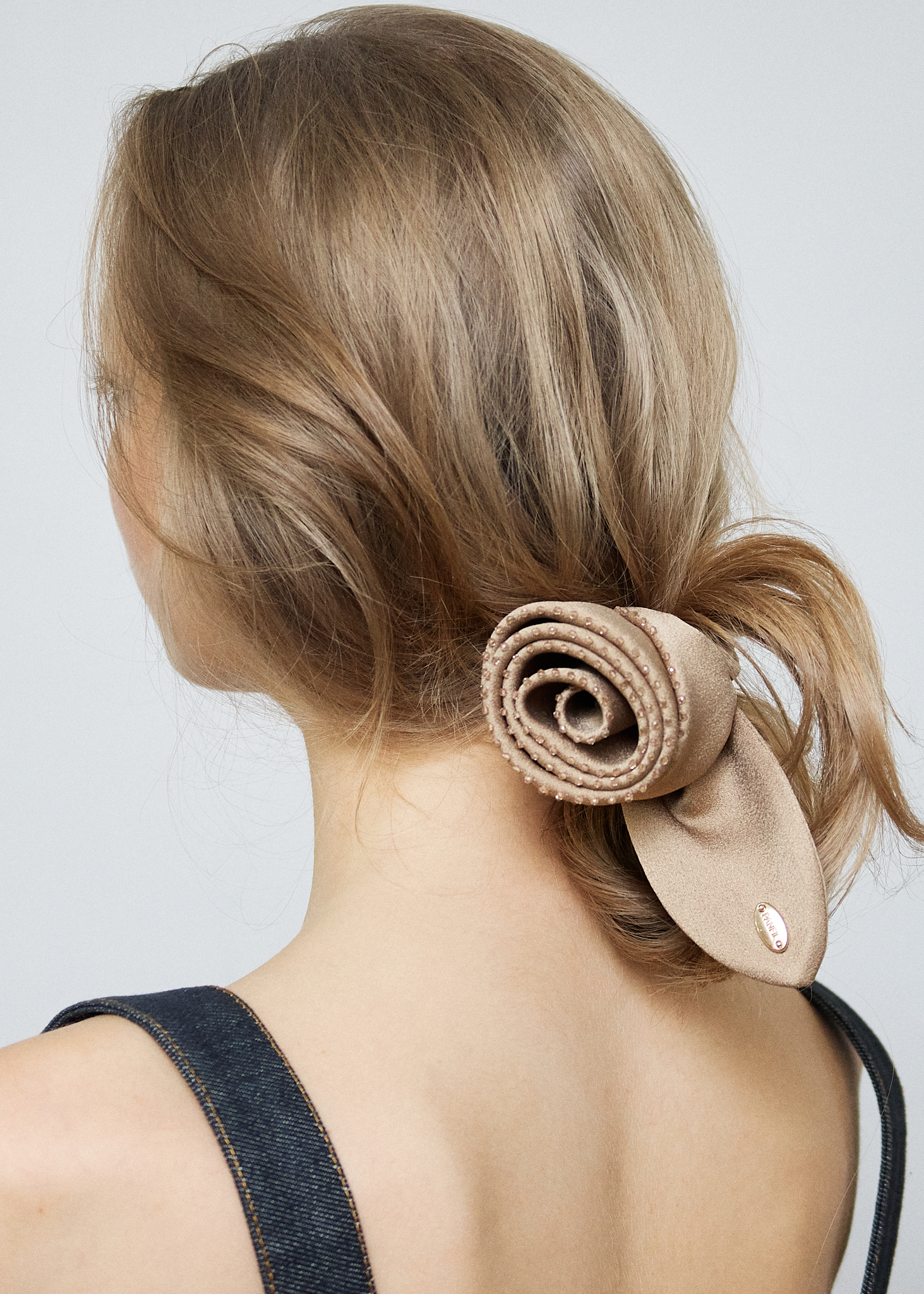 Резинка-роза из золотистого натурального шелка изготовлена и украшена мастерами по авторским техникам бренда.