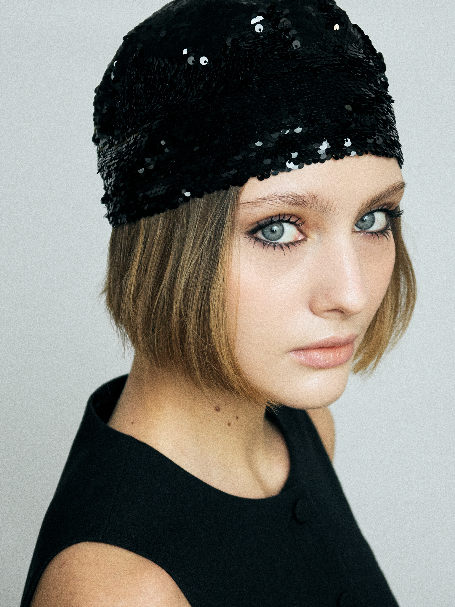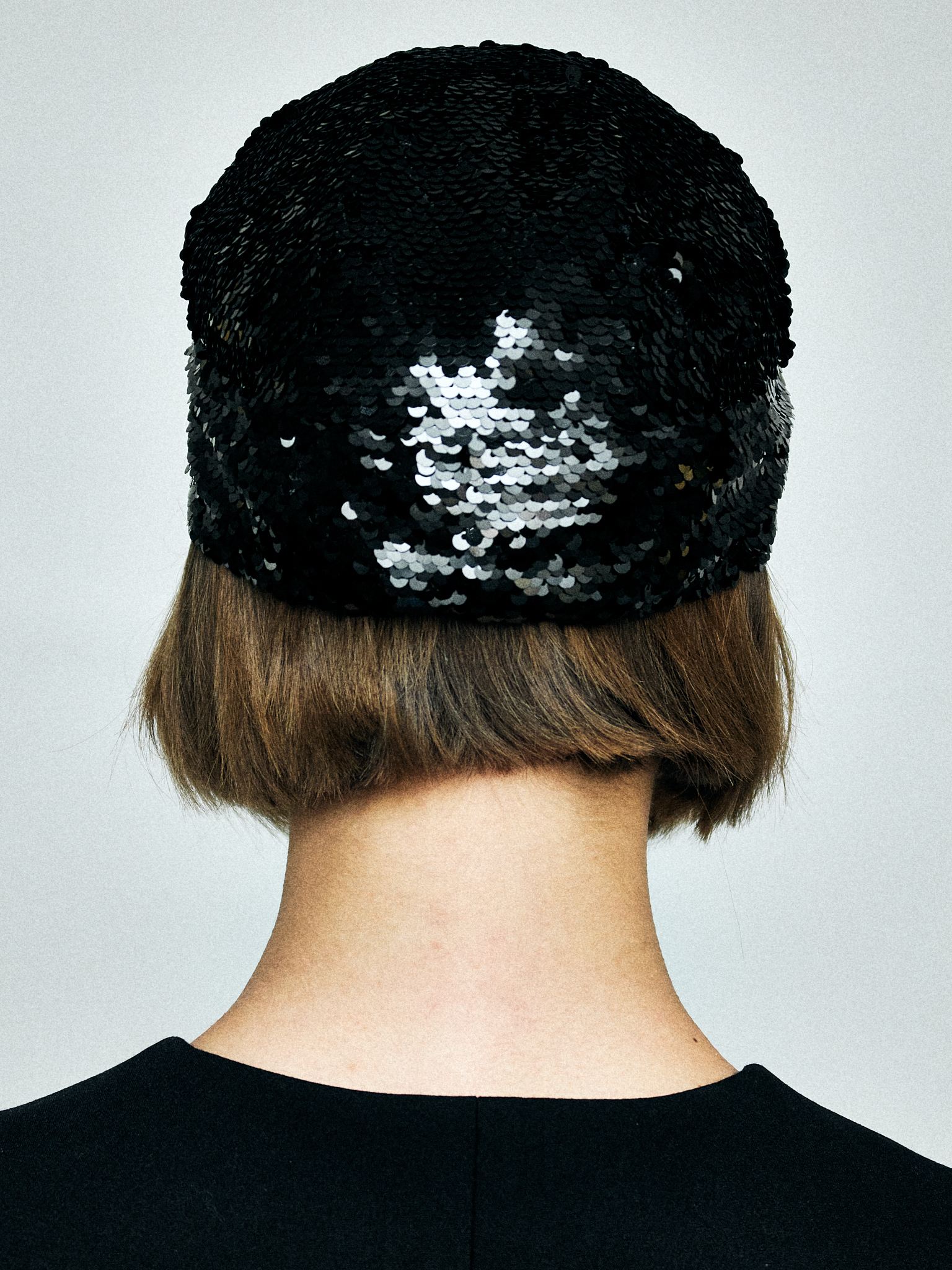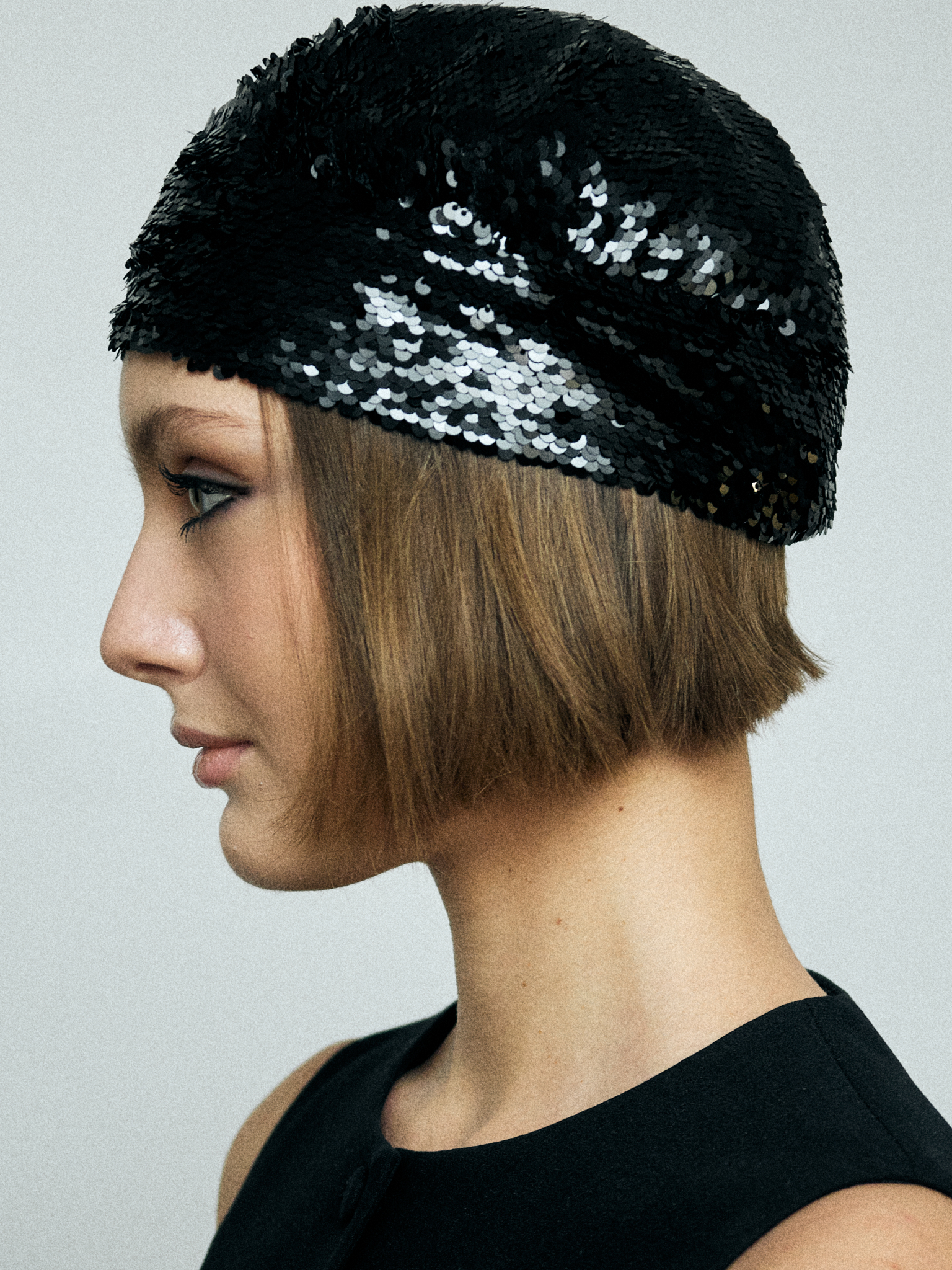 Черная мини шапка в стиле Chanel, выполненная в черной ткани с пайетками в тон.