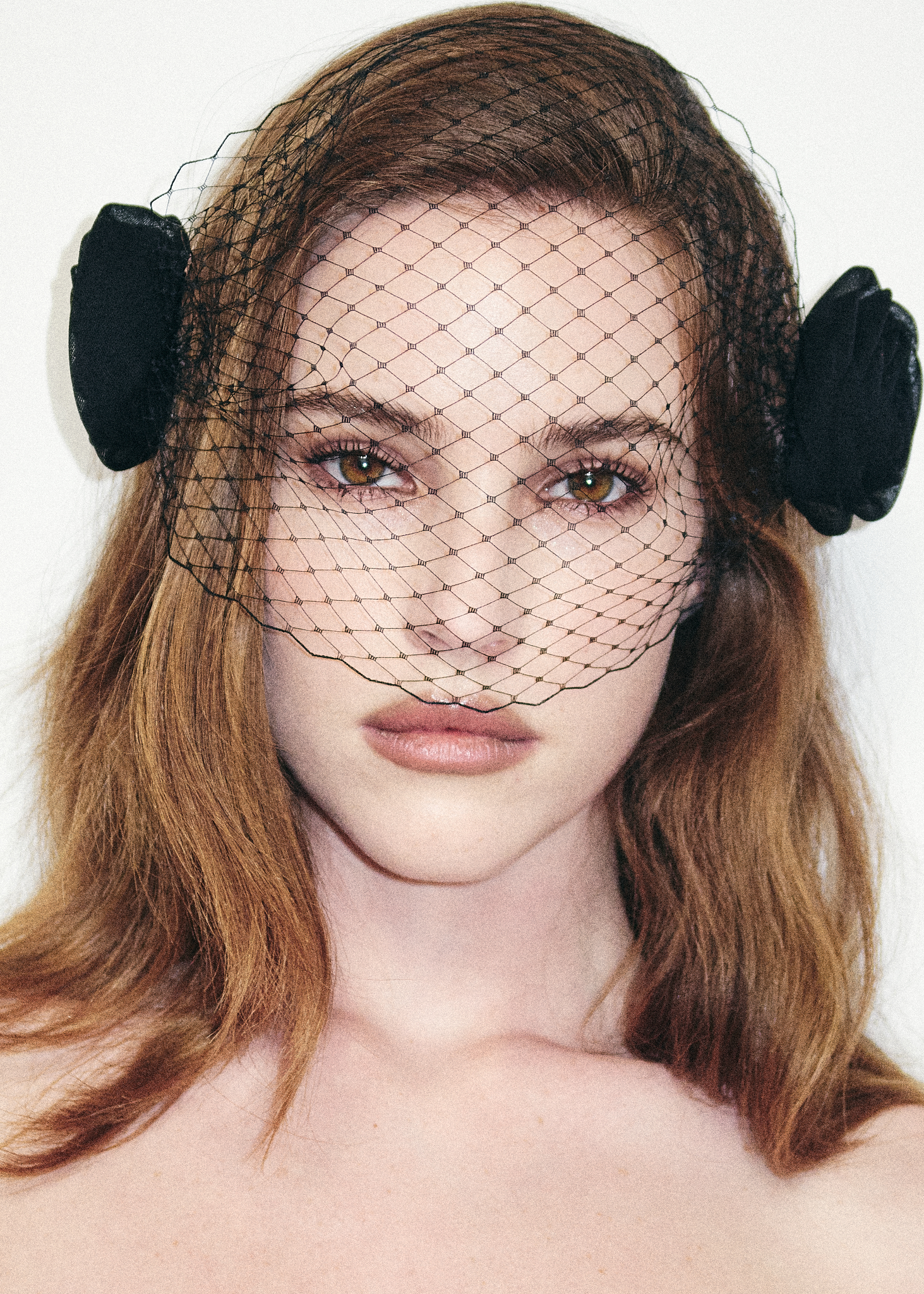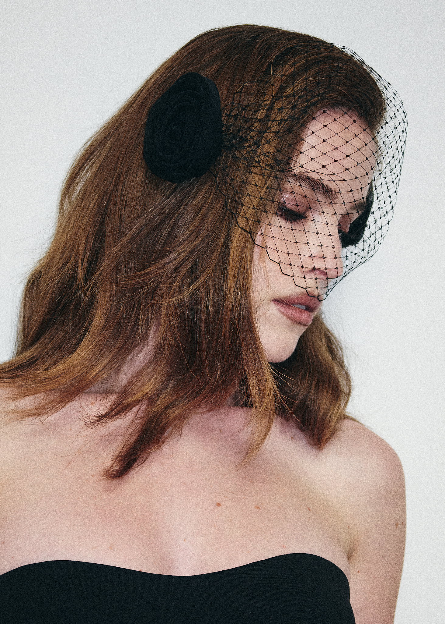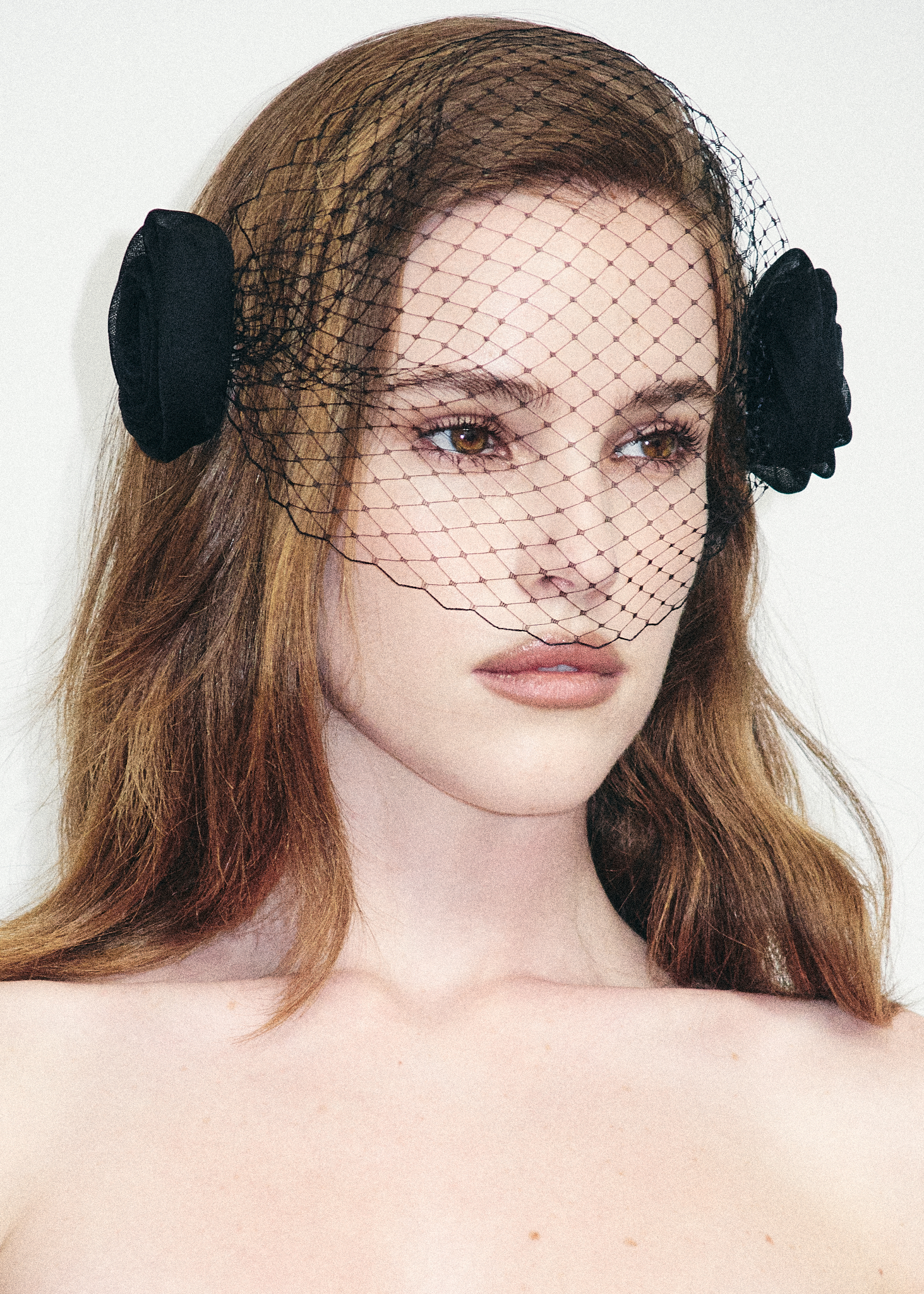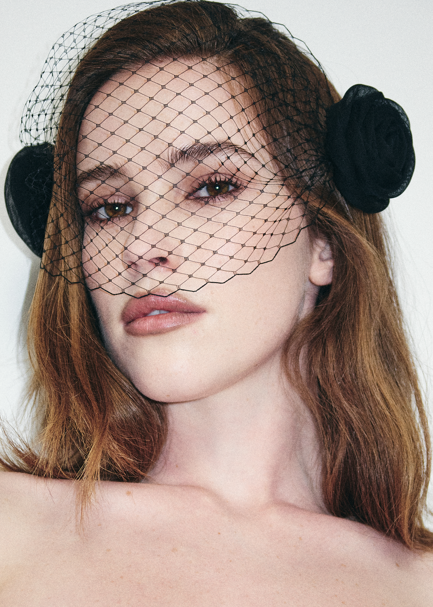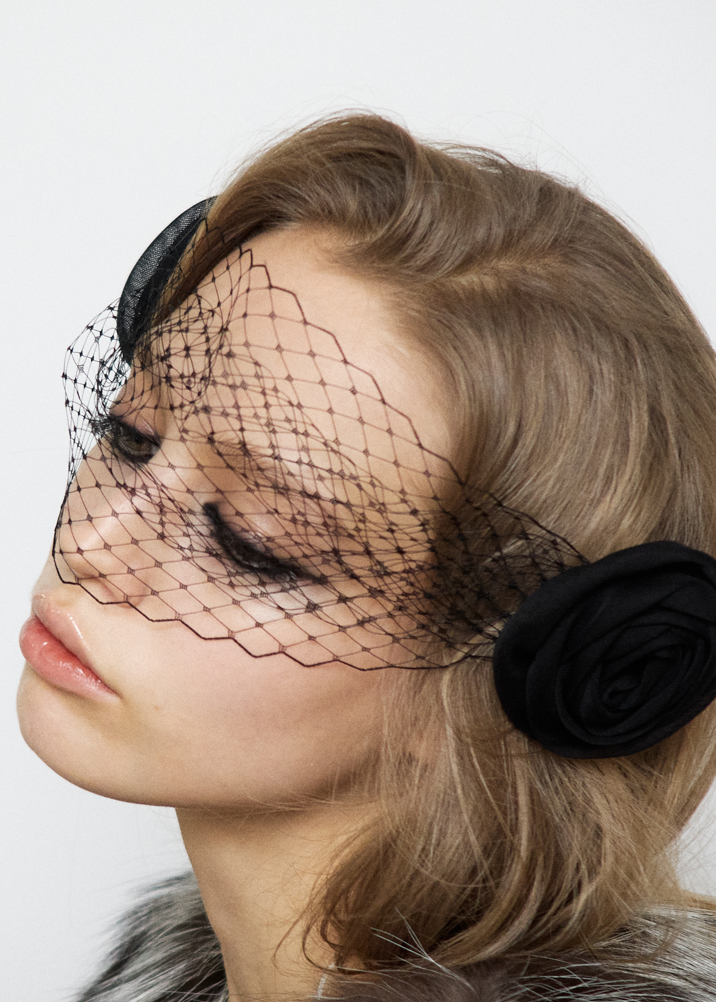 Изящная вуаль ручной работы с нежной сеткой и цветами по бокам добавляет шарма и таинственности вашему образу.