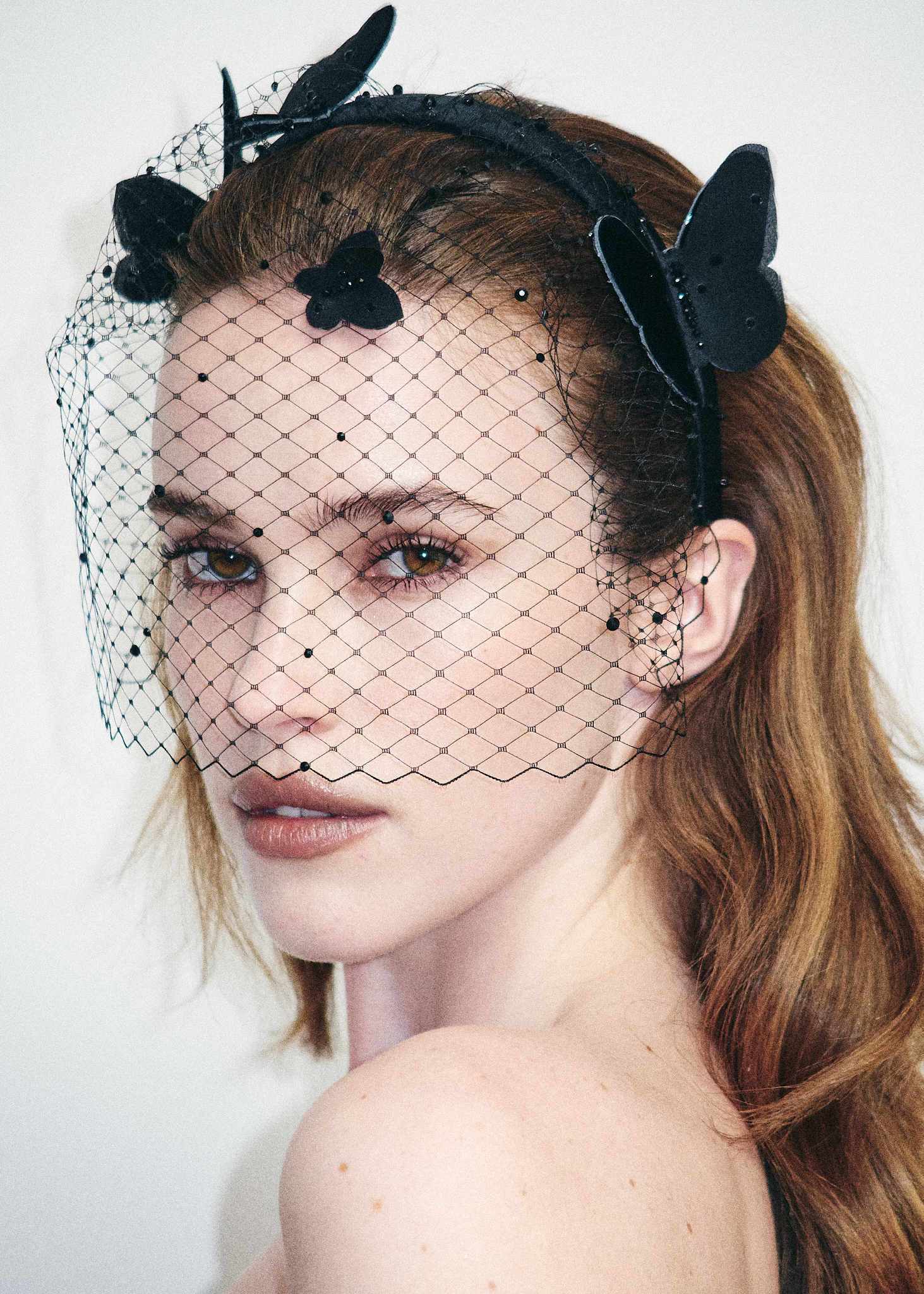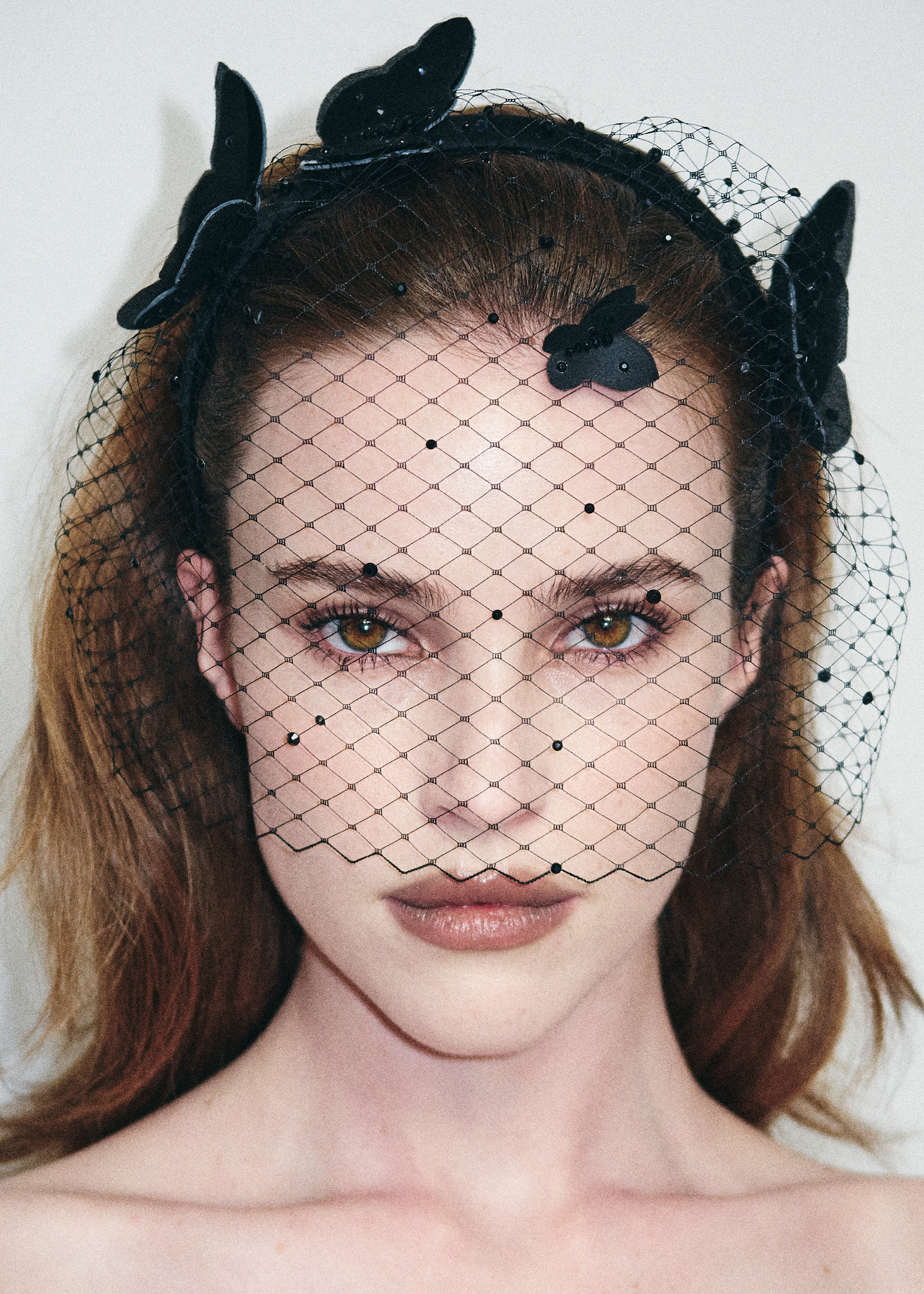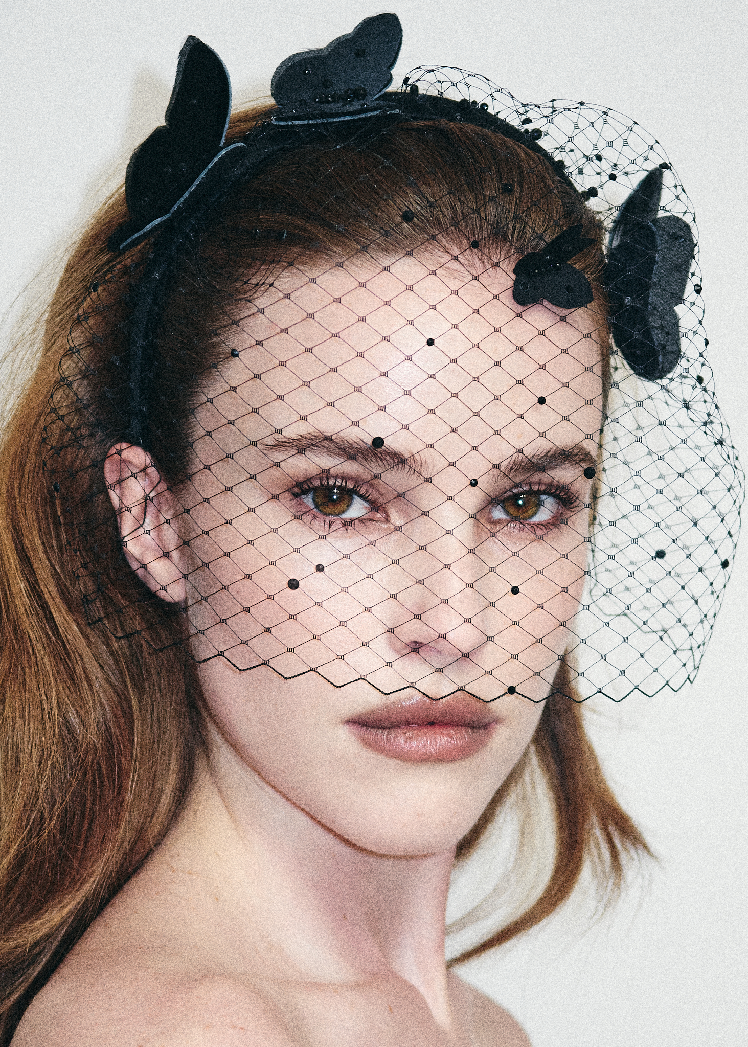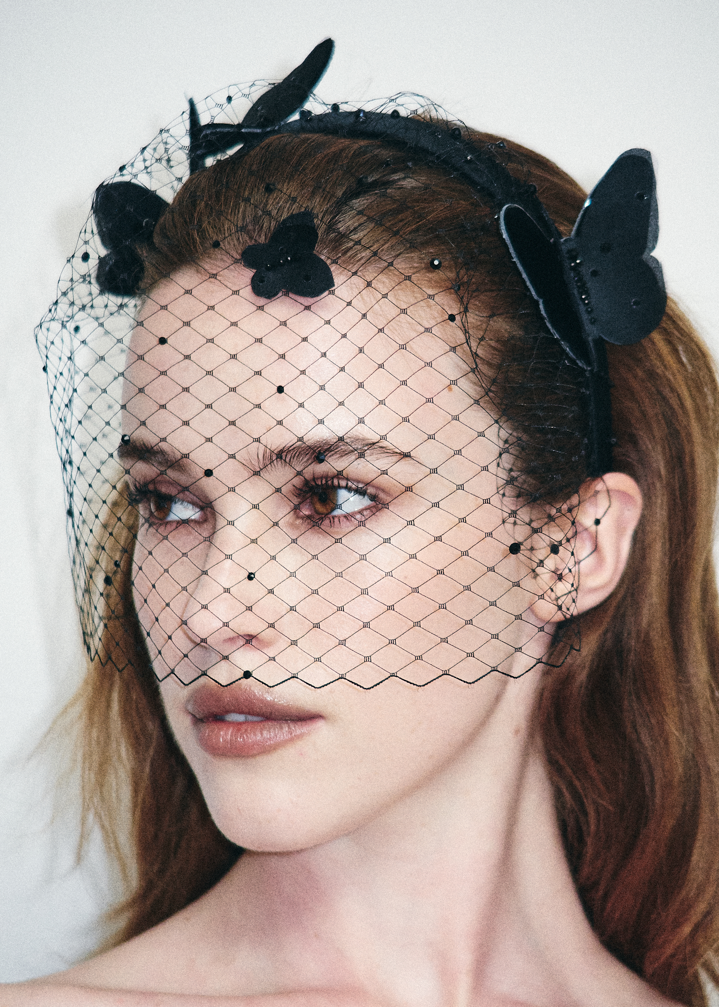 Черная вуаль с легкими шелковыми бабочками и редкими черными камнями.